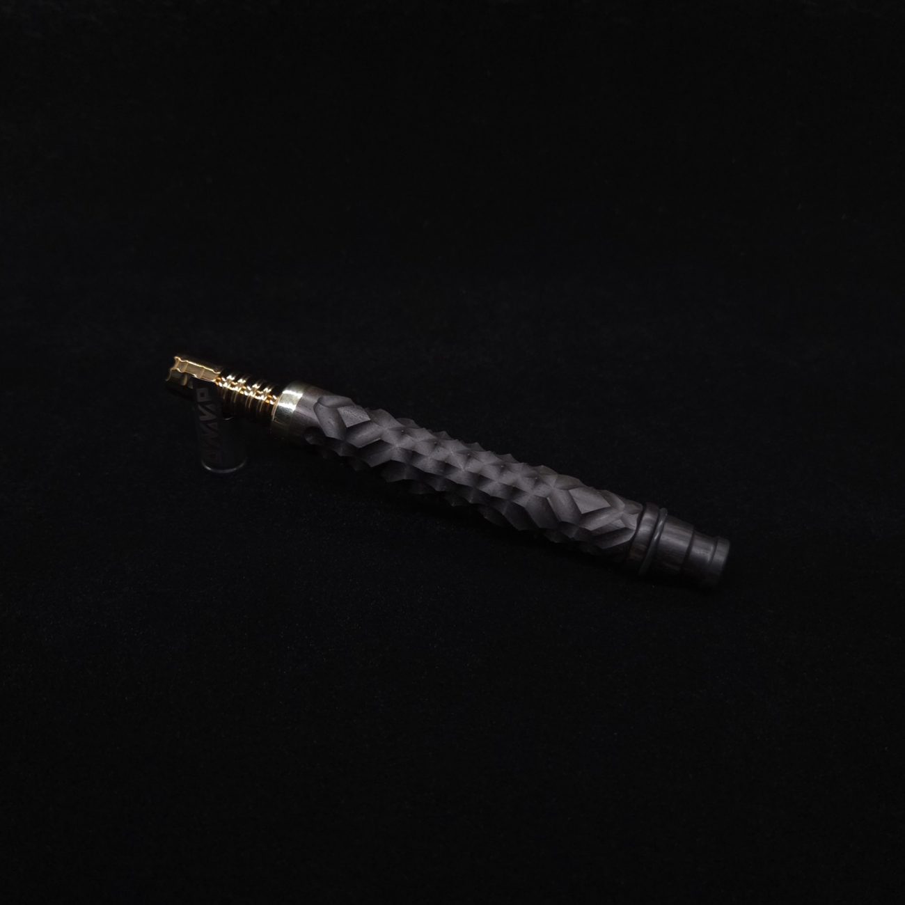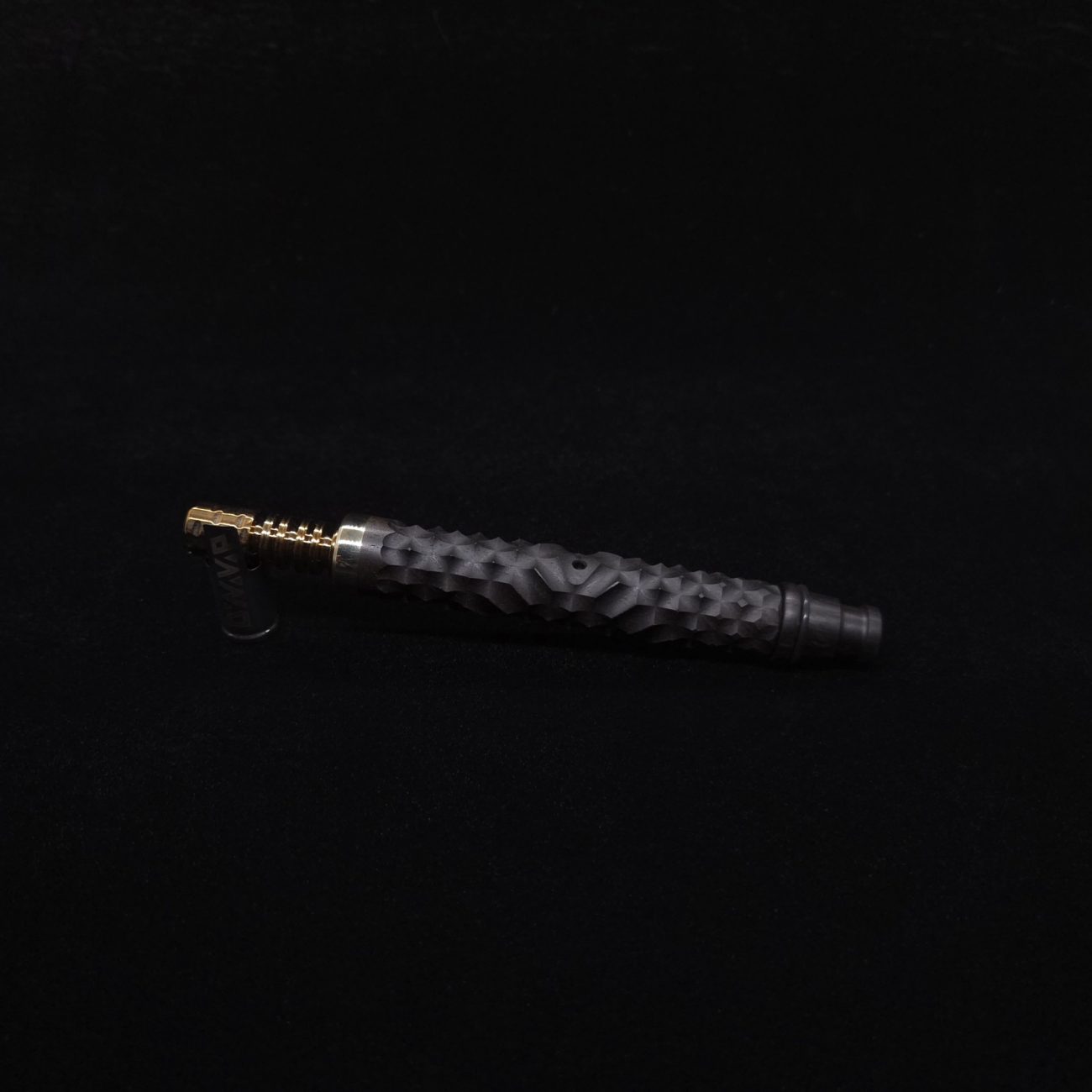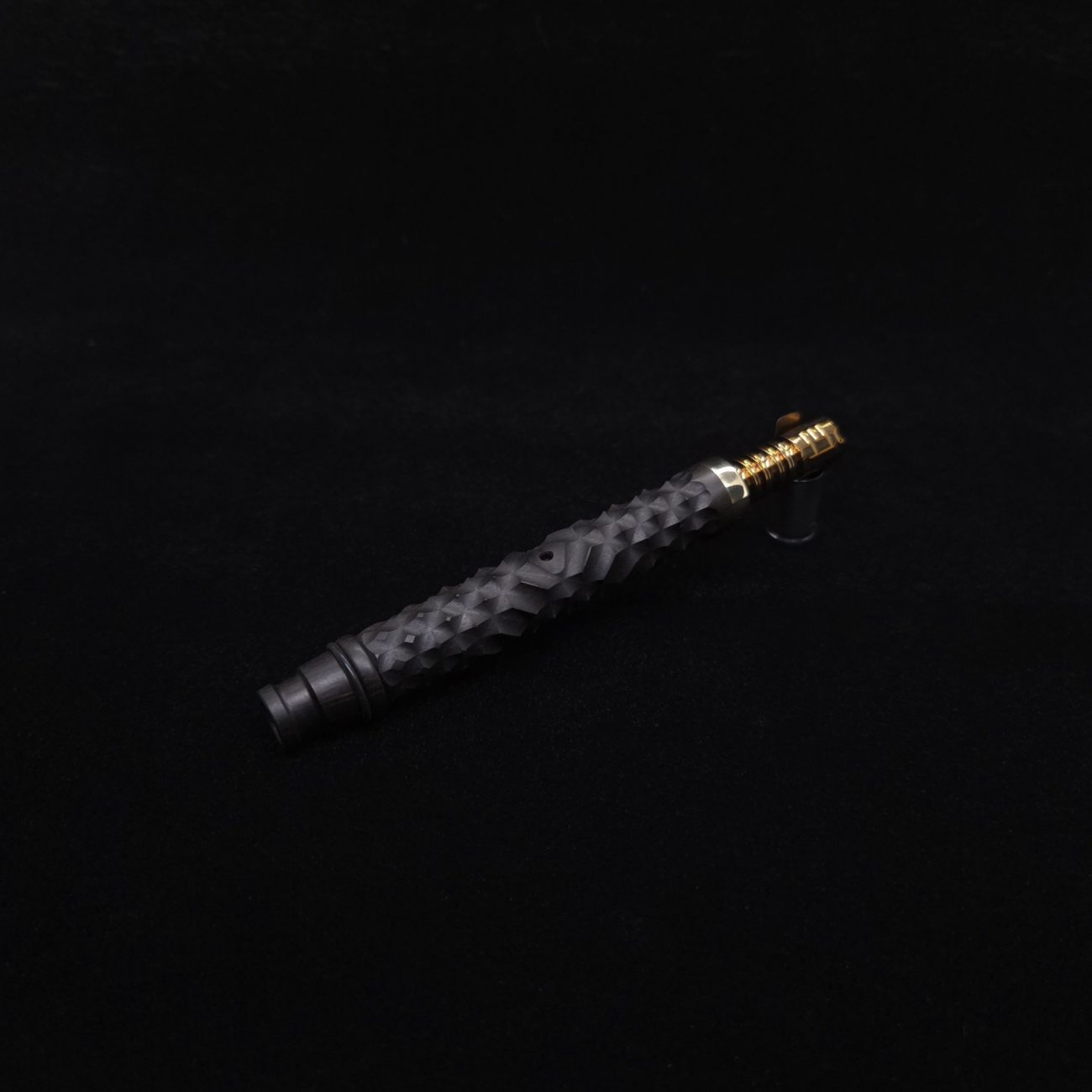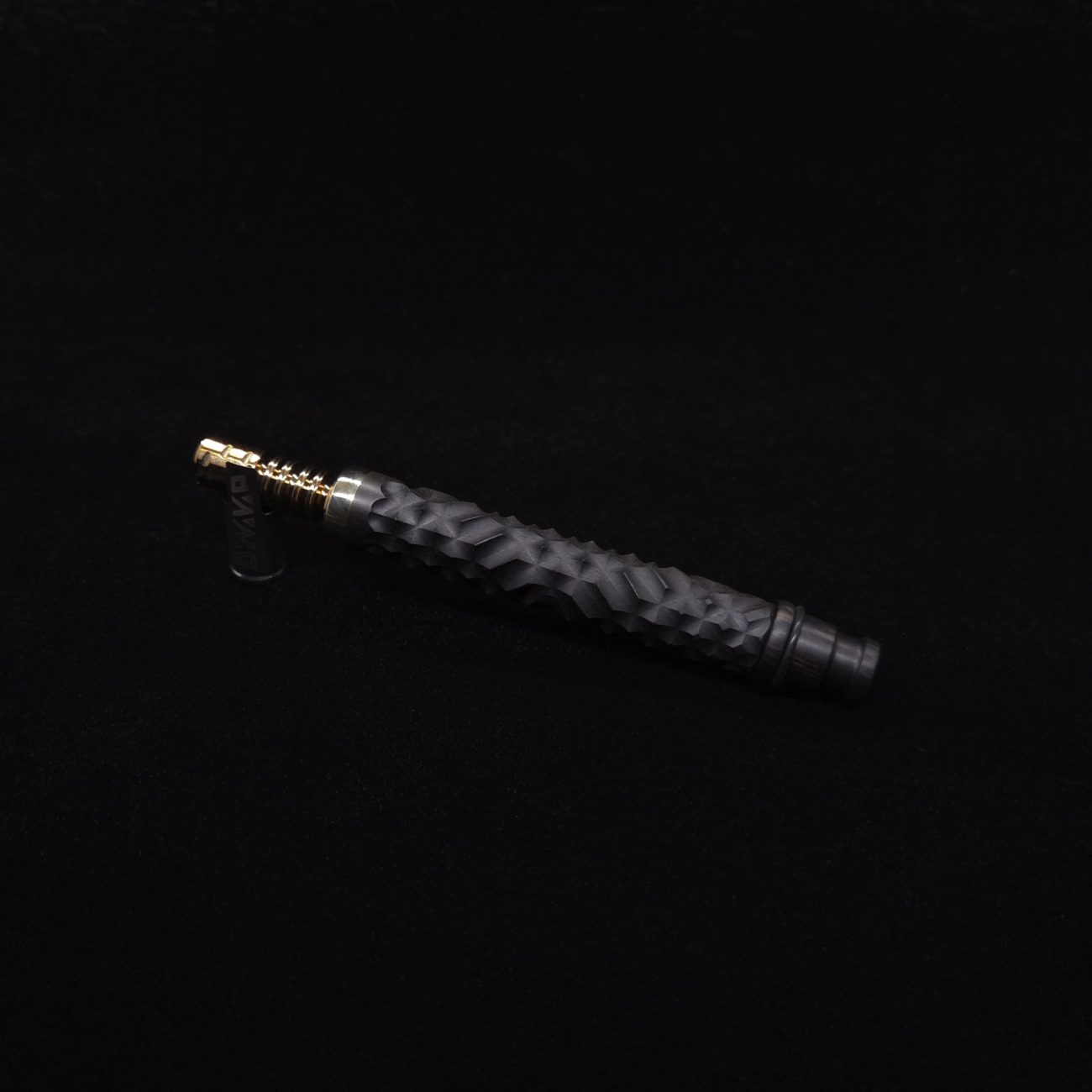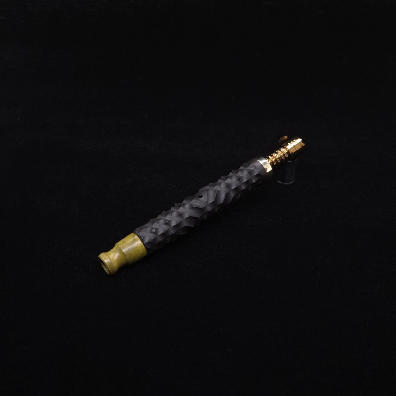 High quality pure black ebony wood XL length stem for Dynavap components. Along with the ebony reaper wpa adaptable mouthpiece as well as a second green buckeye burl m.p. done in our company colors…green/black. This is the high class design variation of our reapers spine stem that we’ve done as a special edition variant that has a 14.5mm brass color at the tip, making it truly high class and unique. Beyond aesthetics, the collar will take on some of the heat transfer, keeping your fingers cool on those occaional high heat sessions. The gold anodized med grade stainless steel condenser has the same o-rings and spaced grooves as the Dynavap titanium xl condenser, but does have a total of 6 grooves where the larger middle o-ring goes. It also matches the gold colored brass collar nicely. This is to allow for any length differences there may be in any mouthpiece you use. That way it will fit snug no matter the m.p. you use. This condenser differs from the XL Dynavap condenser in that when using the mouthpiece it will reach all the way to the inside of the Dynavap tip, making for a stronger draw from the tip to the mouthpiece. Mouthpiece has an o-ring groove where you attach one of the included o-rings for use with a wpa. This is also another of our stem designs that has an amazing detailed complex cut that’s usually reserved for metal, but we’ve applied it to certain wood/resin stems that can hold such detailed cuts. The design has pointed sections cut in across the length of the stem with the concave airport centered and easy to locate. All of our stems do function with or without mouthpiece attached. You do have the option of using any Dynavap condenser as well. Stem has been finished with a satin finish polishing and is all natural.