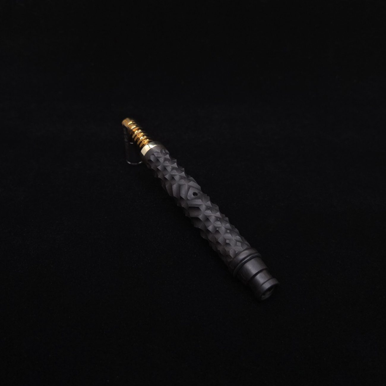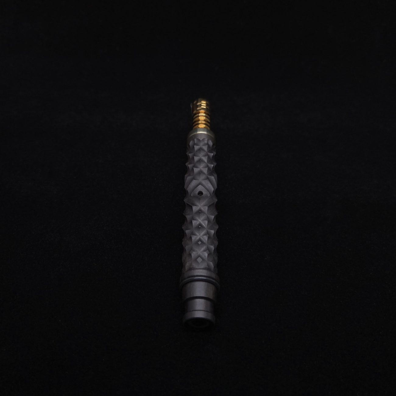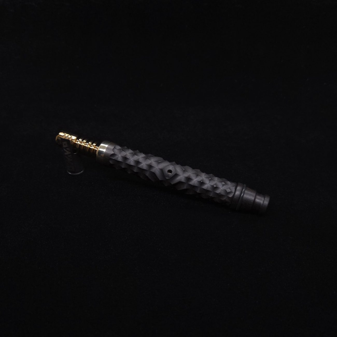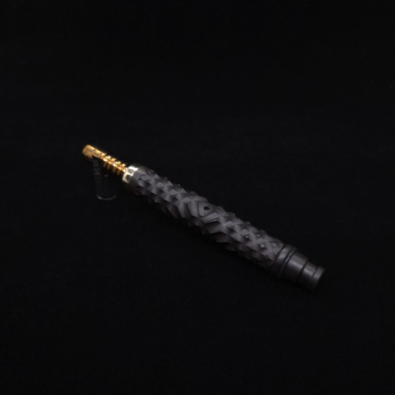 High quality pure black ebony wood XL length stem for Dynavap components. Along with the ebony reaper wpa adaptable mouthpiece as well as a second green buckeye burl m.p. done in our company colors…green/black. This is the high class design variation of our reapers spine stem that we’ve done as a special edition variant that has a 14.5mm brass color at the tip, making it truly high class and unique. Beyond aesthetics, the collar will take on some of the heat transfer, keeping your fingers cool on those occaional high heat sessions. The gold anodized med grade stainless steel condenser has the same o-rings and spaced grooves as the Dynavap titanium xl condenser, but does have a total of 6 grooves where the larger middle o-ring goes. It also matches the gold colored brass collar nicely. This is to allow for any length differences there may be in any mouthpiece you use. That way it will fit snug no matter the m.p. you use. This condenser differs from the XL Dynavap condenser in that when using the mouthpiece it will reach all the way to the inside of the Dynavap tip, making for a stronger draw from the tip to the mouthpiece. Mouthpiece has an o-ring groove where you attach one of the included o-rings for use with a wpa. This is also another of our stem designs that has an amazing detailed complex cut that’s usually reserved for metal, but we’ve applied it to certain wood/resin stems that can hold such detailed cuts. The design has pointed sections cut in across the length of the stem with the concave airport centered and easy to locate. All of our stems do function with or without mouthpiece attached. You do have the option of using any Dynavap condenser as well. Stem has been finished with a satin finish polishing and is all natural.