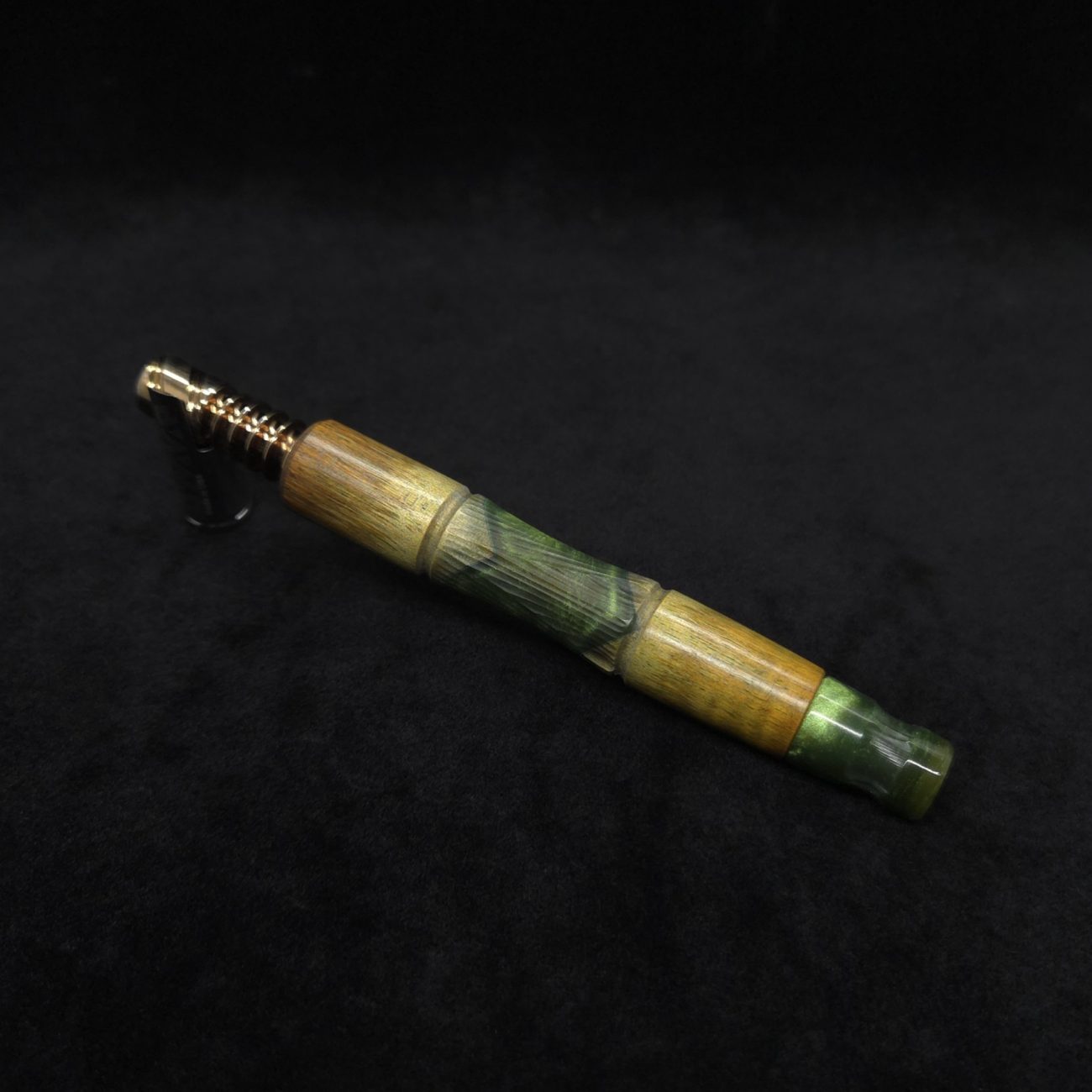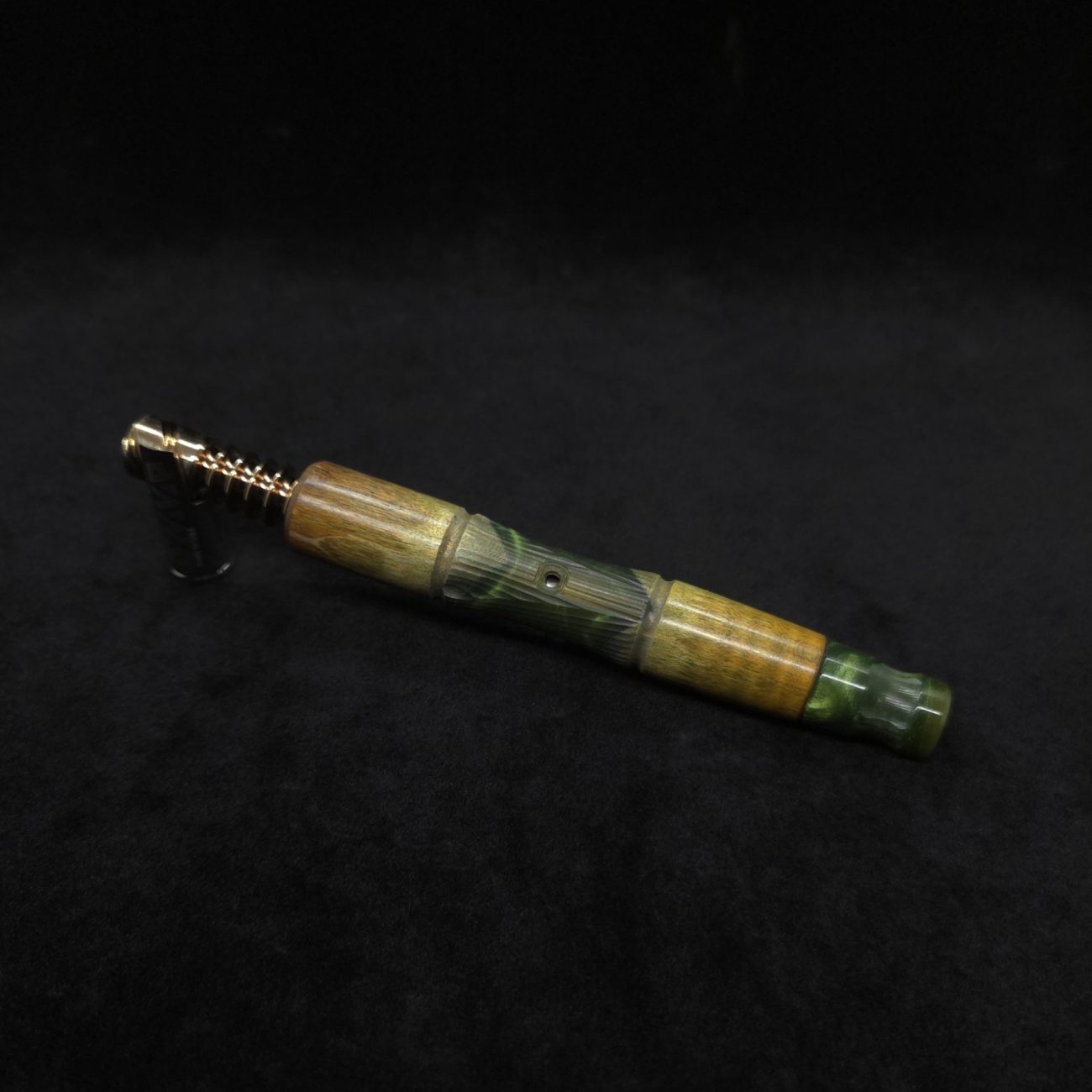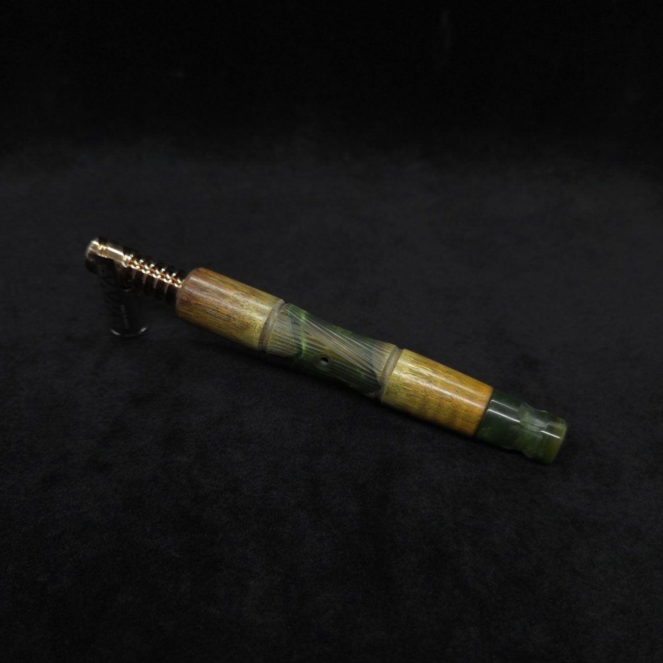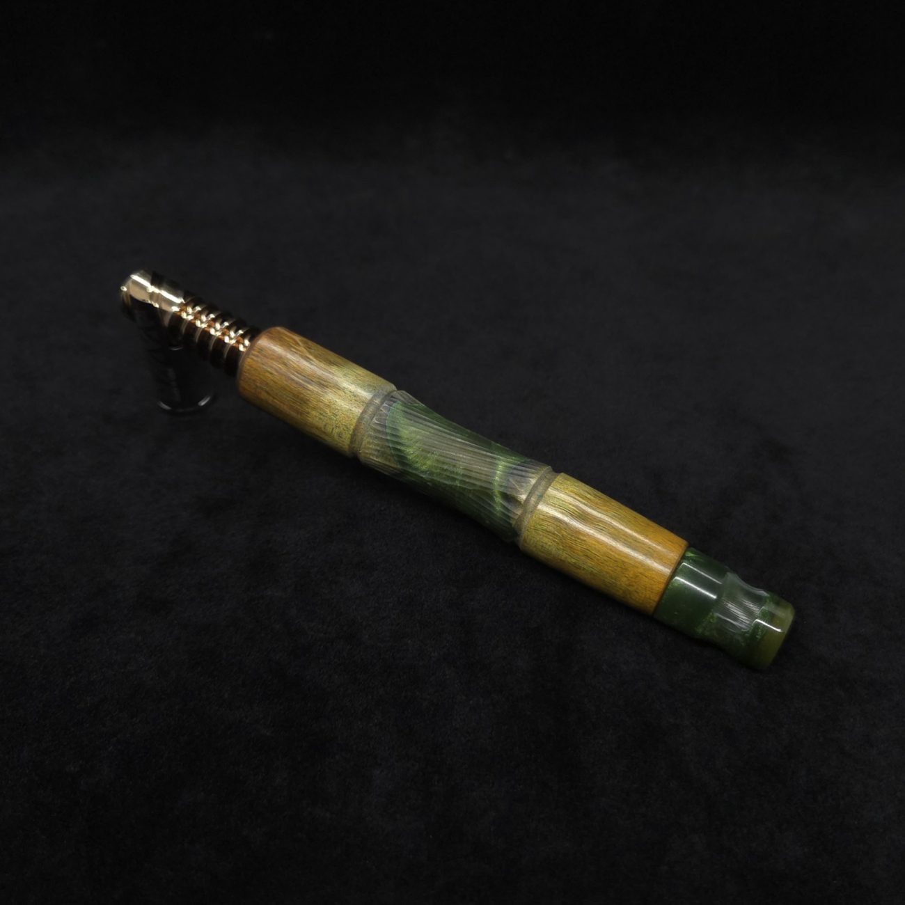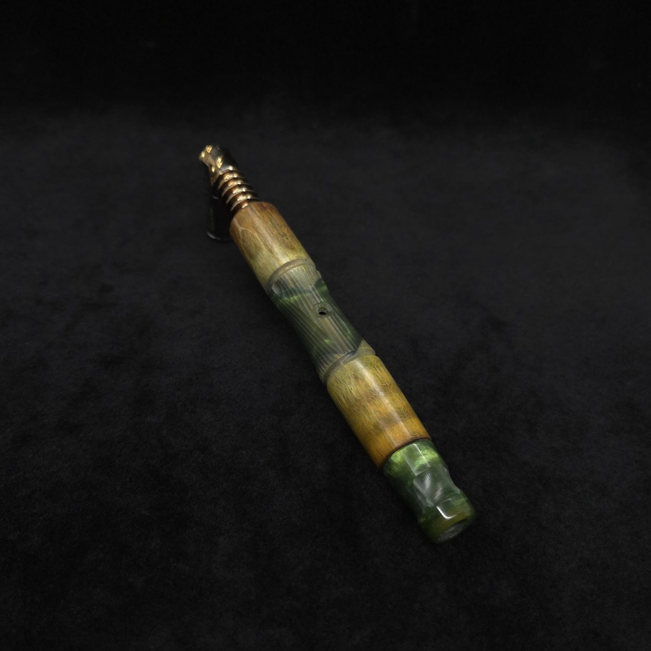 High quality wavy maple burl wood hybrid, XL length stem for Dynavap components. Along with a book-matched king’s design mouthpiece. Burl is colored olive and golden green with hybrid color in a vibrant metallic olive green. Burl wood on this particular stem has been cut with an arrow cut between the wood pieces, giving a special look where wood meets hybrid middle section. This stem design has an amazing detailed center cut usually reserved for metal, but we’ve applied it to certain wood/resin stems that can hold such detailed cuts and look great doing it. The concave middle section has angles cut from three different axis that intersect together and make for a perfect stem balance with a textured feel. It has the straight taper hourglass shape with spiraled cross-cut sections. Stem is capable of adapting to a 14mm glass water device. All of our stems function with or without mouthpiece attached. Stem has been finished with a low gloss finish polishing and is all natural.