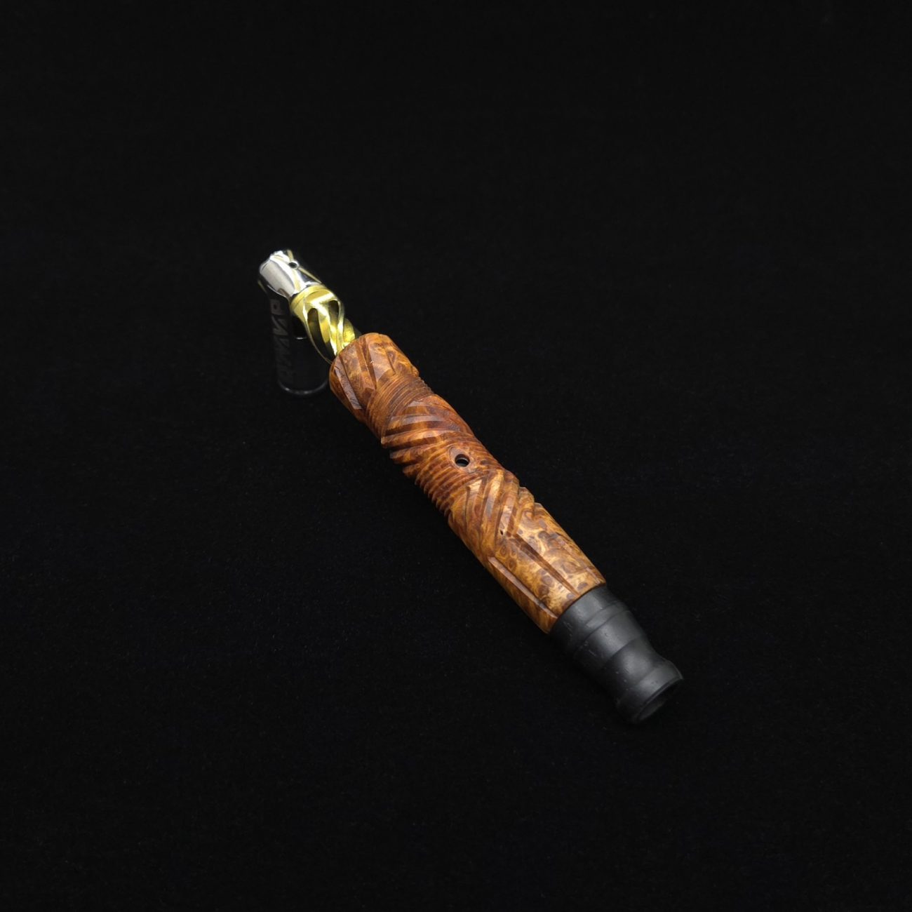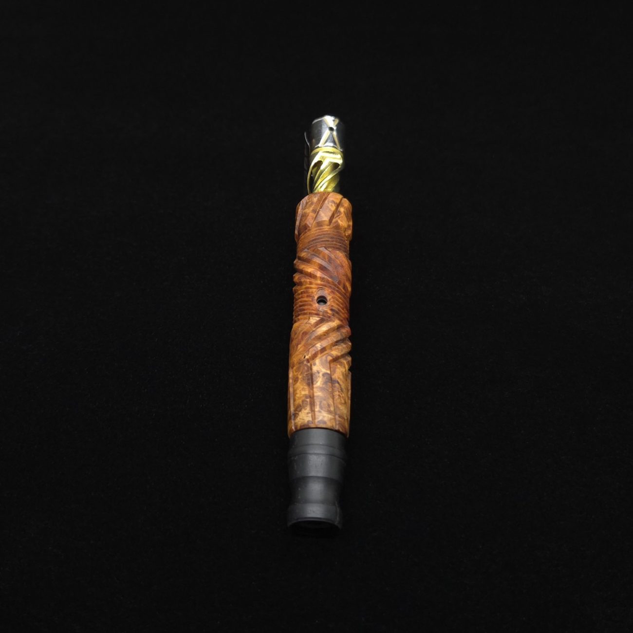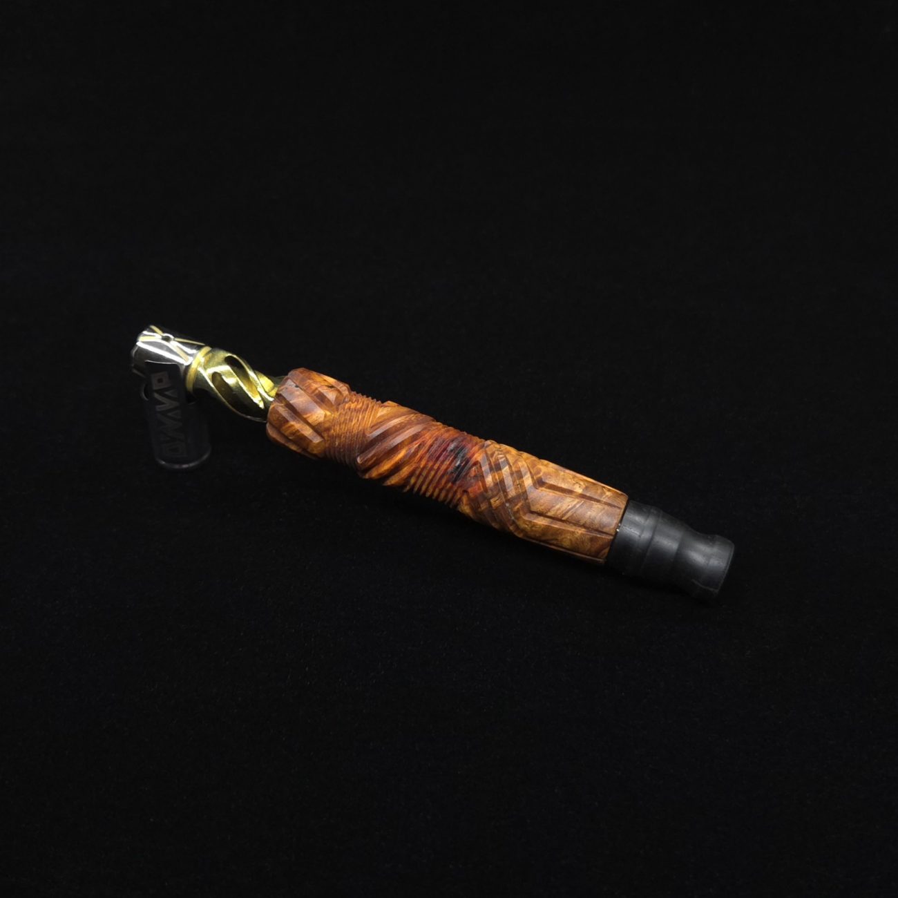 High quality amboyna burl wood (standard) length stem for Dynavap components. Along with a matched ebony barrel design mouthpiece. This newest twisted stems series stem design is a personal favorite. It is another of our stem designs that has an amazing detailed complex cut that’s usually reserved for metal, but we’ve applied it to certain wood/resin stems that can hold such detailed cuts…and look great doing it. The design is essentially a set of spiraled lines that have been twisted and bent into sections that all use different angles while conforming to the desired layout where your finger rests perfectly over the centered air-port. The v-cut lines are a great tactile feature. The mouthpiece is a dual sided m.p. that has two flat sides and two rounded concave sides. All of our stems function with or without mouthpiece attached. Stem has been finished with a satin finish polishing and is all natural.