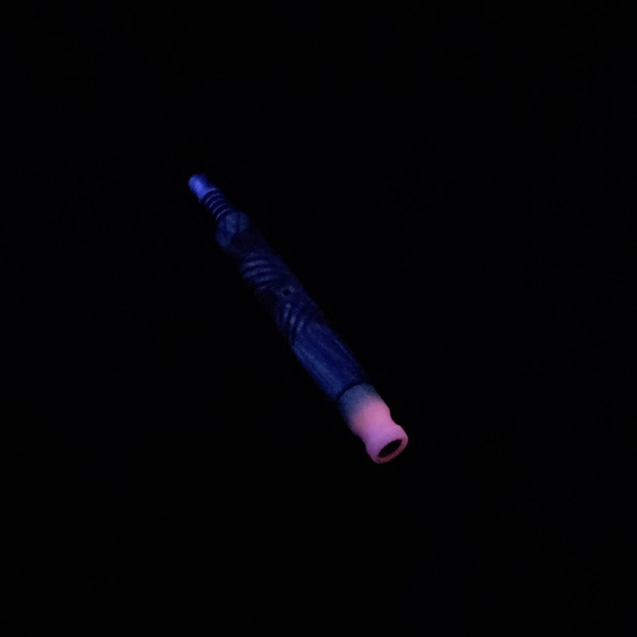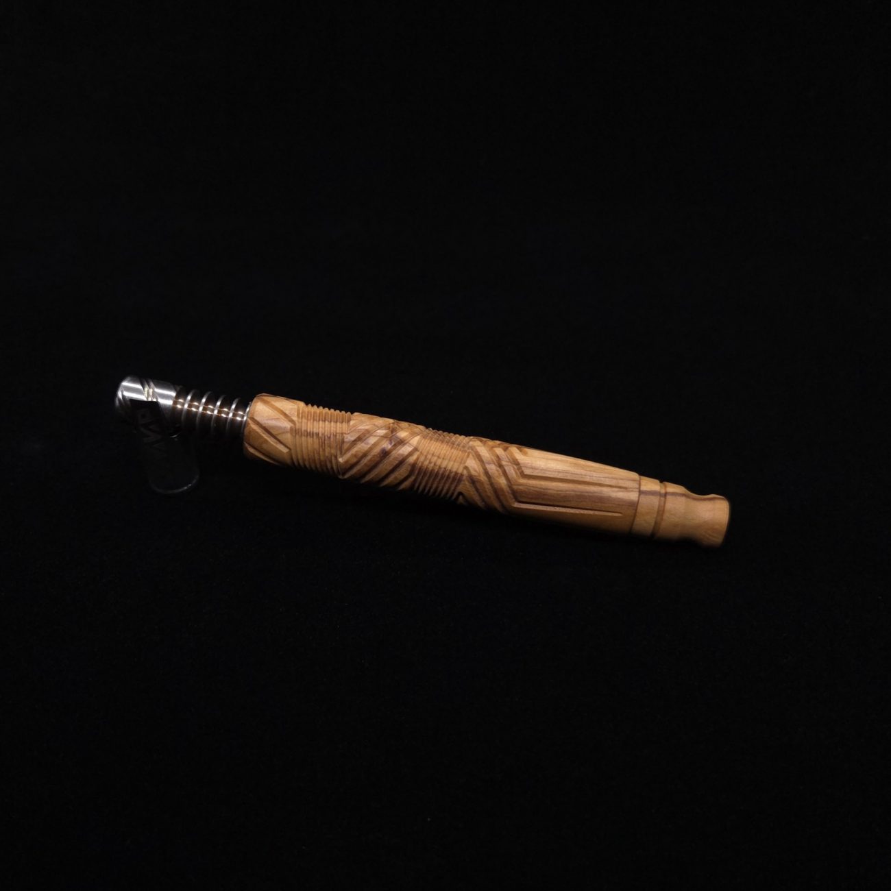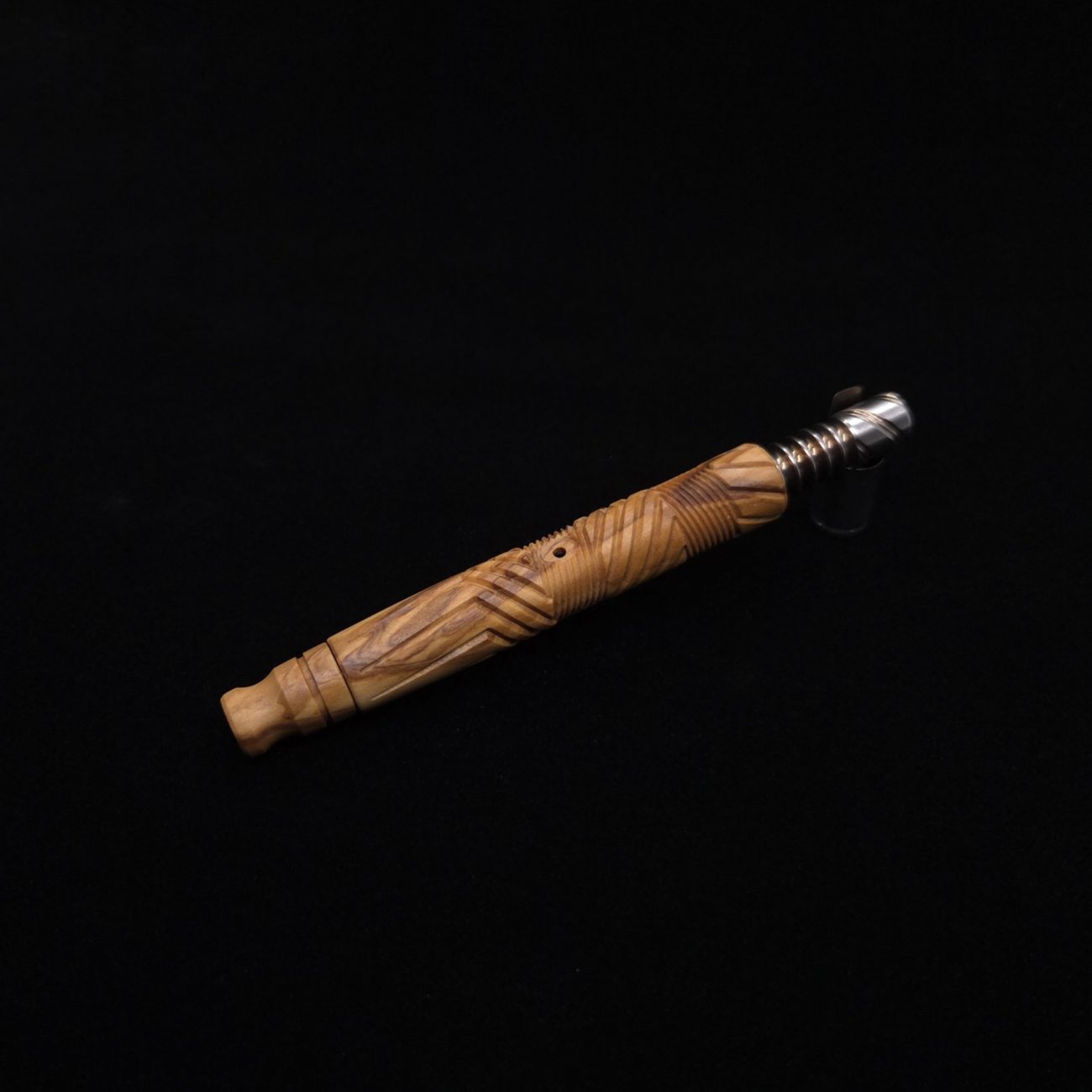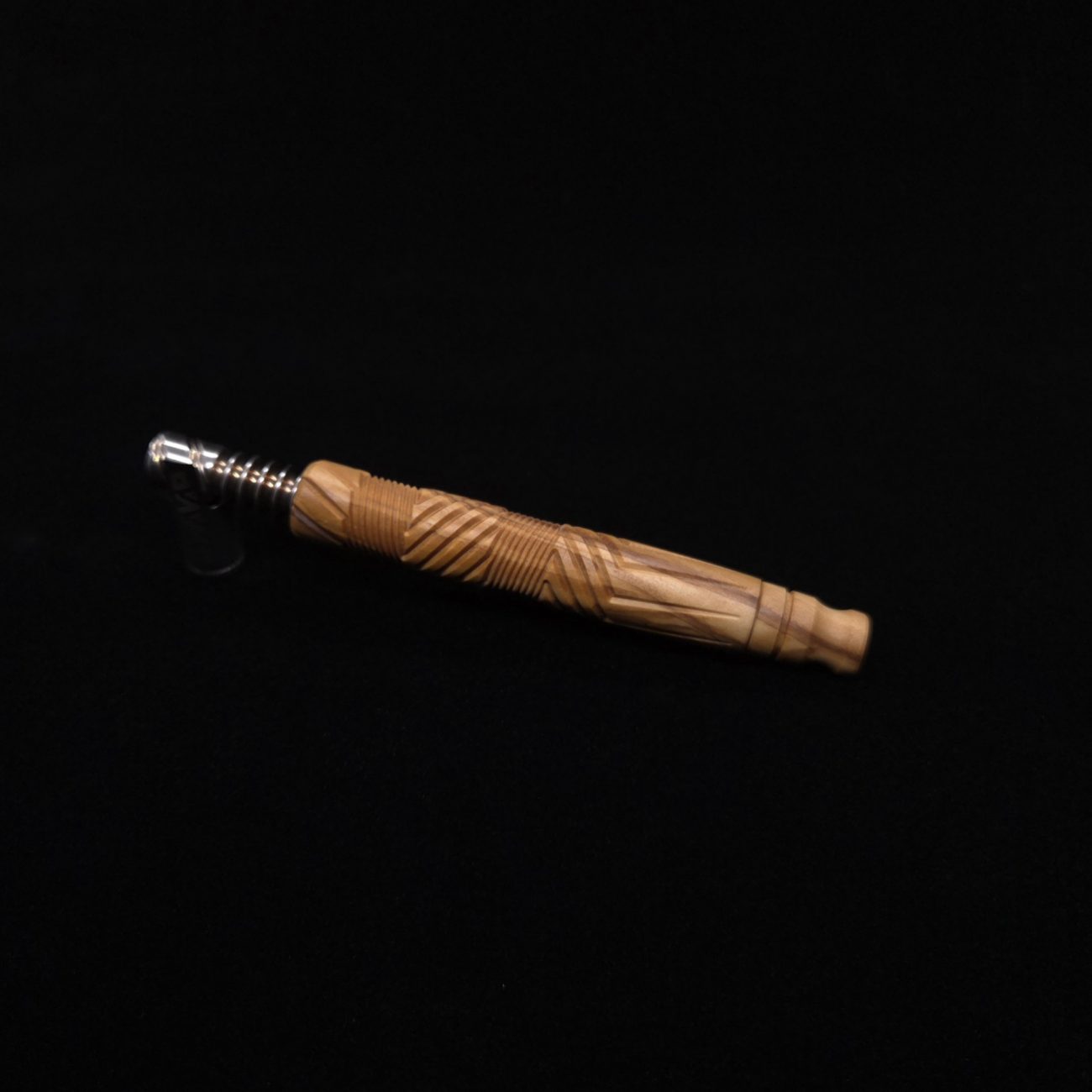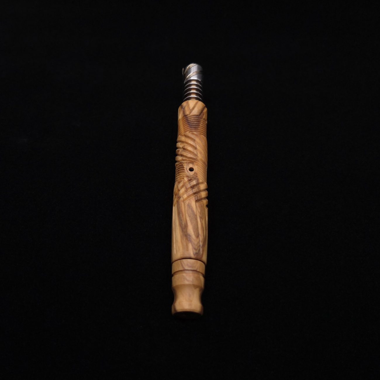 High quality Olivewood XL length stem for Dynavap components. Along with (2) mouthpieces…one specialty design olivewood and a bonus m.p. that is pearl white/green and luminescent orange. This newest twisted stems series stem design is a personal favorite. It is another of our stem designs that has an amazing detailed complex cut that’s usually reserved for metal, but we’ve applied it to certain wood/resin stems that can hold such detailed cuts…and look great doing it. The design is essentially a set of spiraled lines that have been twisted and bent into sections that all use different angles while conforming to the desired layout where your finger rests perfectly over the centered air-port. The v-cut lines are a great tactile feature. The mouthpiece is a dual sided m.p. that has two flat sides and two rounded concave sides. All of our stems function with or without mouthpiece attached. Stem has been finished with a satin finish polishing and is all natural.