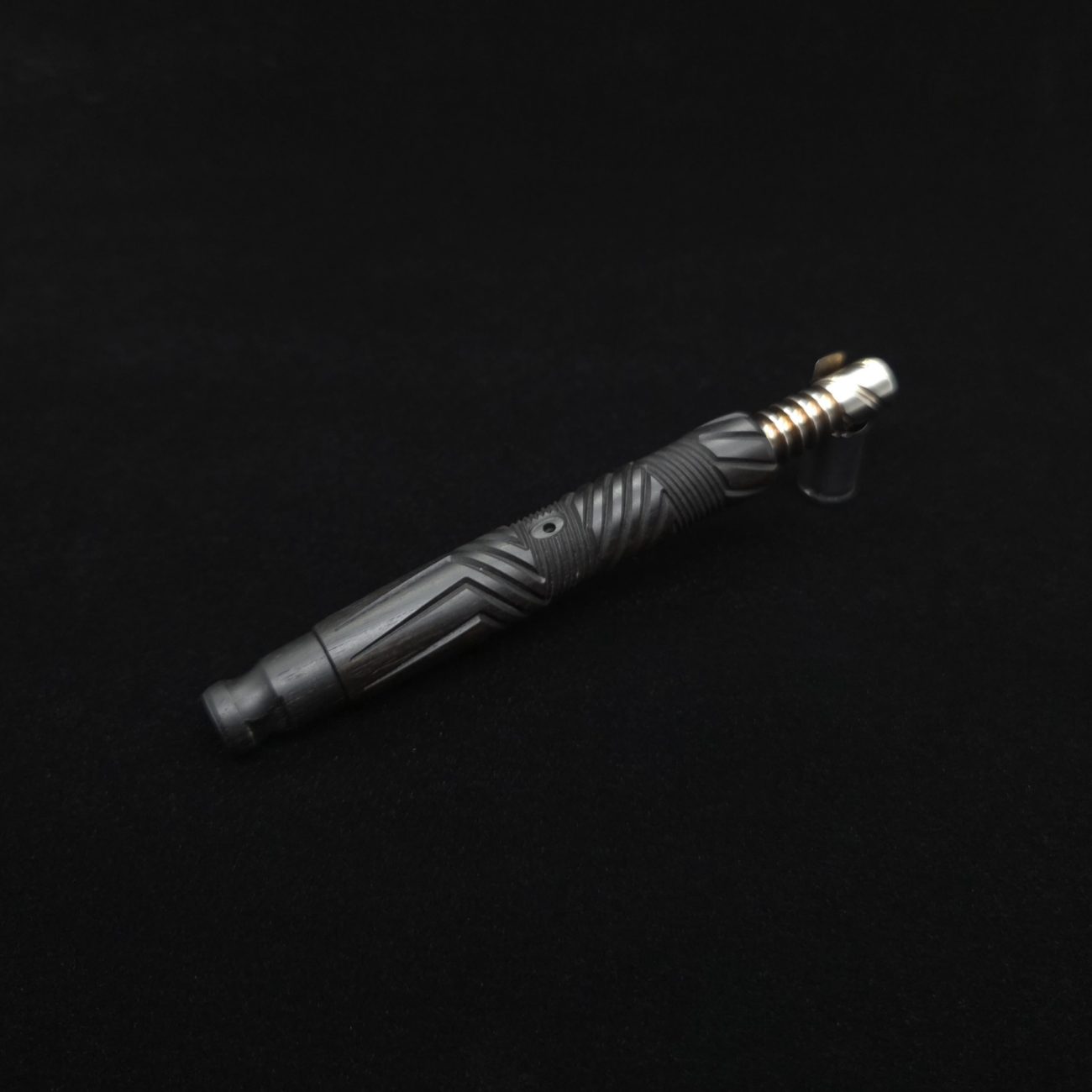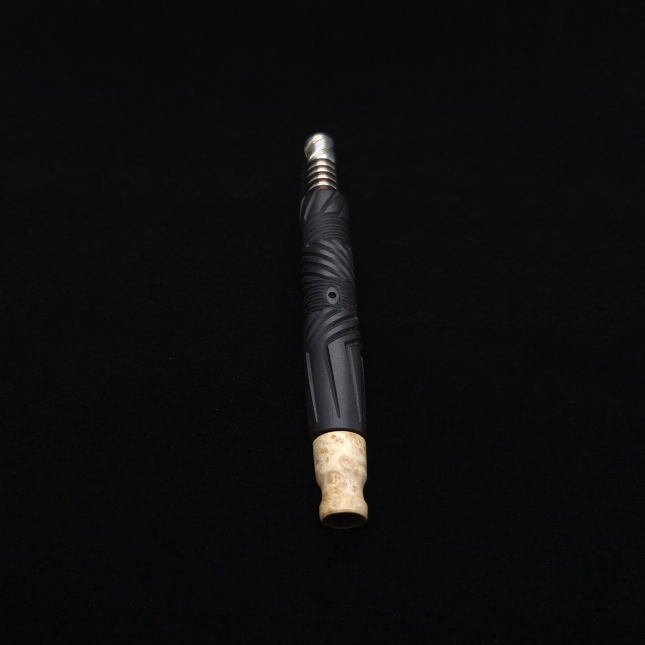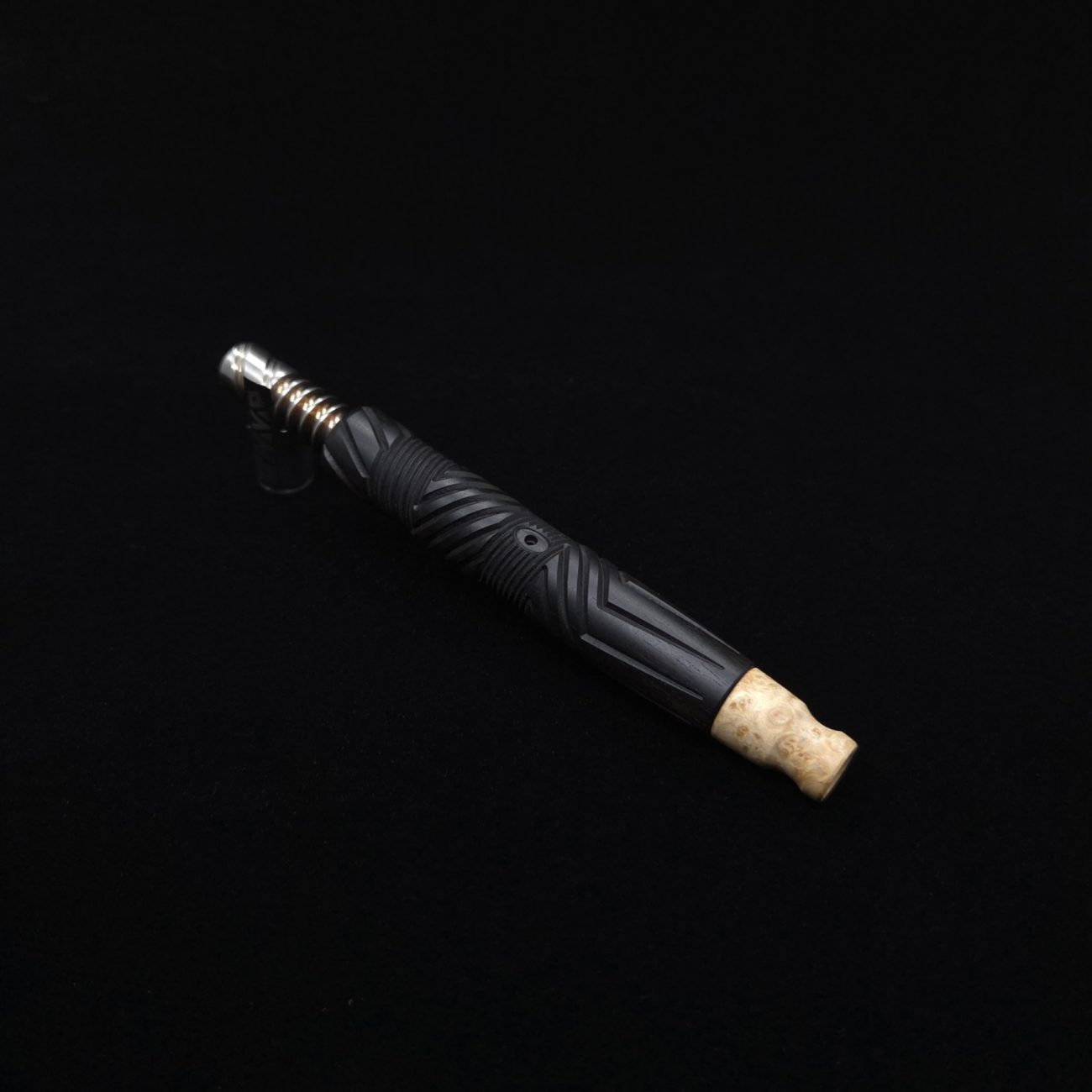 High quality pure black ebony wood XL length stem for Dynavap components. Along with (2) mouthpieces…one dual sided ebony and box elder burl. This newest twisted stems series stem design is a personal favorite. It is another of our stem designs that has an amazing detailed complex cut that’s usually reserved for metal, but we’ve applied it to certain wood/resin stems that can hold such detailed cuts…and look great doing it. The design is essentially a set of spiraled lines that have been twisted and bent into sections that all use different angles while conforming to the desired layout where your finger rests perfectly over the centered air-port. The v-cut lines are a great tactile feature. The mouthpiece is a dual sided m.p. that has two flat sides and two rounded concave sides. All of our stems function with or without mouthpiece attached. Stem has been finished with a satin finish polishing and is all natural.