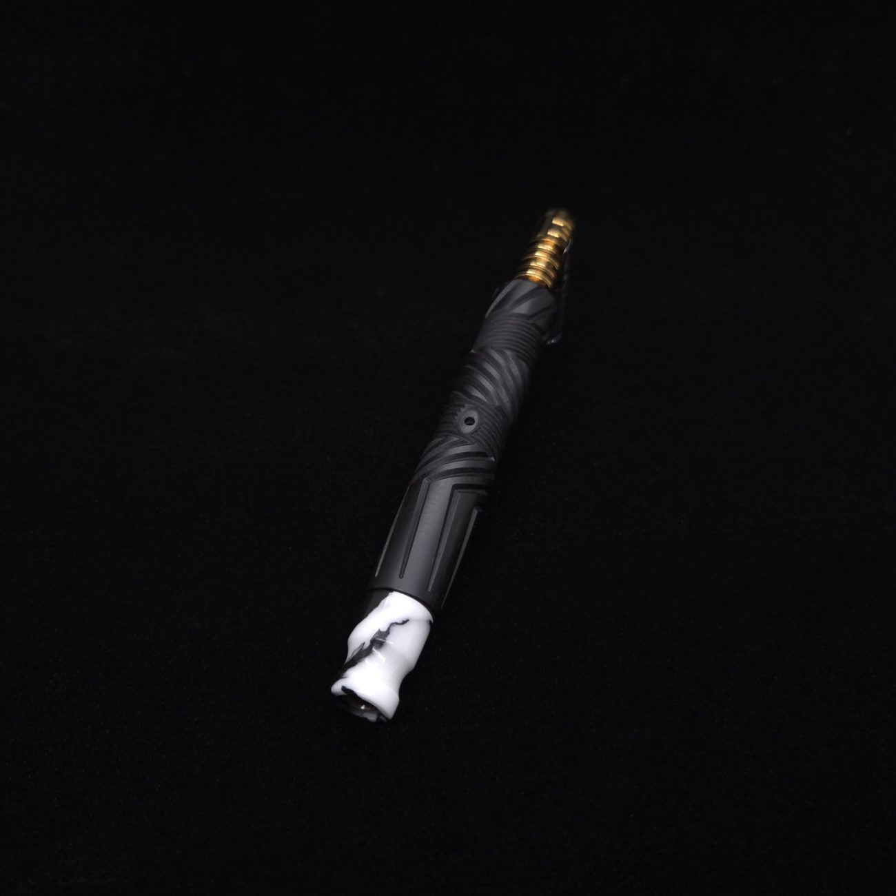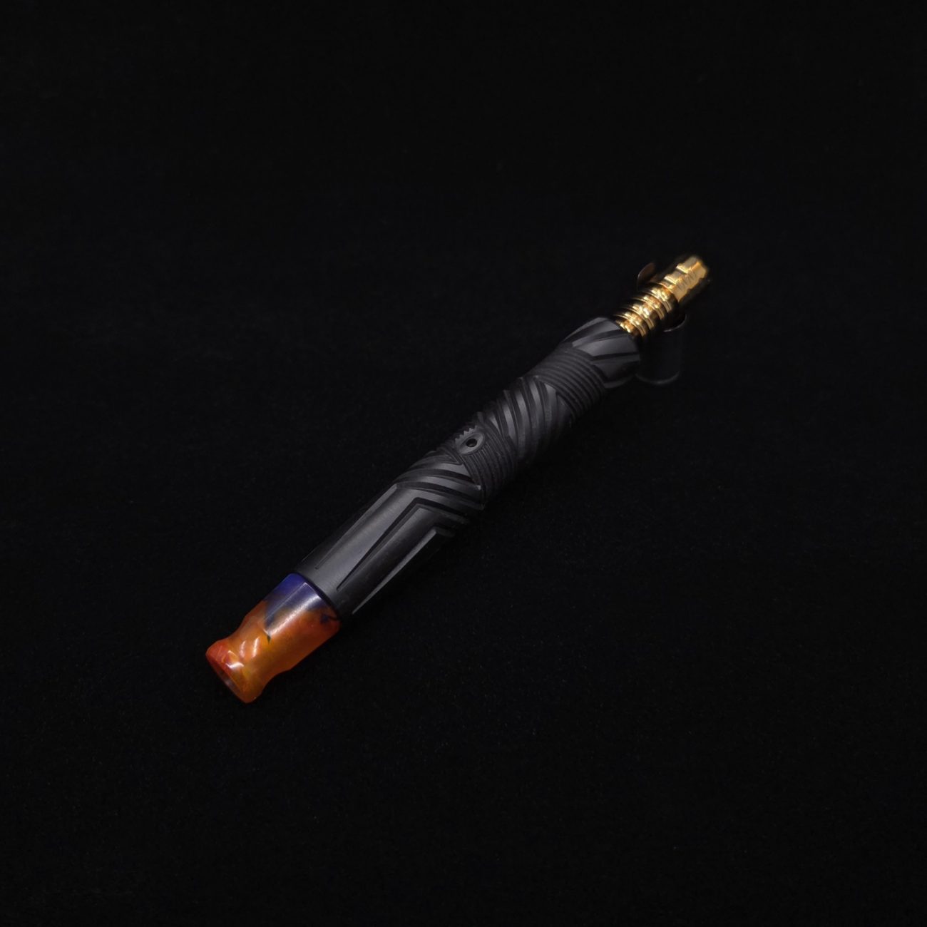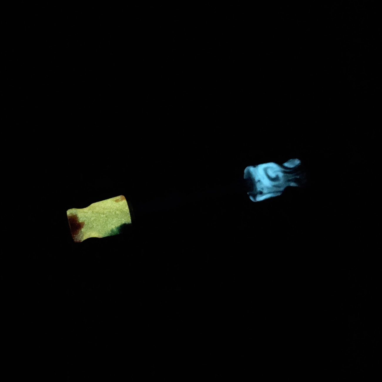 High quality pure black ebony wood XL length stem for Dynavap components. Along with (4) mouthpieces as a Halloween special…one specialty design ebony and one black/white marble and a (2) bonus 🎃 luminescent m.p.’s in a black/white marbled that glows aqua and a metallic orange with splash of metallic blue that glows pineapple yellow in the dark. This newest twisted stems series stem design is a personal favorite. It is another of our stem designs that has an amazing detailed complex cut that’s usually reserved for metal, but we’ve applied it to certain wood/resin stems that can hold such detailed cuts…and look great doing it. The design is essentially a set of spiraled lines that have been twisted and bent into sections that all use different angles while conforming to the desired layout where your finger rests perfectly over the centered air-port. The v-cut lines are a great tactile feature. To connect to glass device with a 14mm tapered hole, simply slide the included o-ring over the mouthpiece that will rest in the groove between m.p. and stem. This will produce the air-tight seal needed to pull flawless hits. All of our stems function with or without mouthpiece attached. Stem has been finished with a satin finish polishing and is all natural.