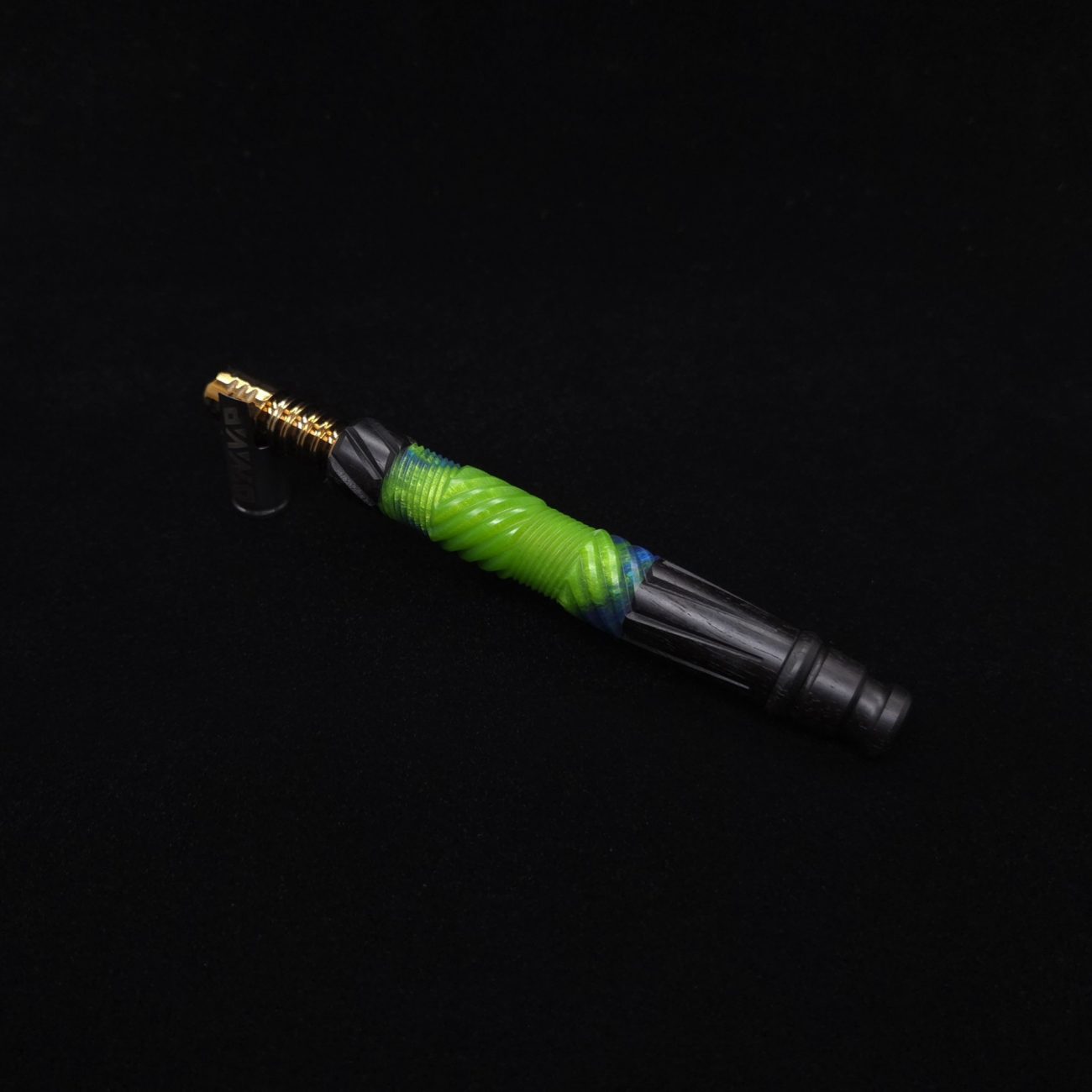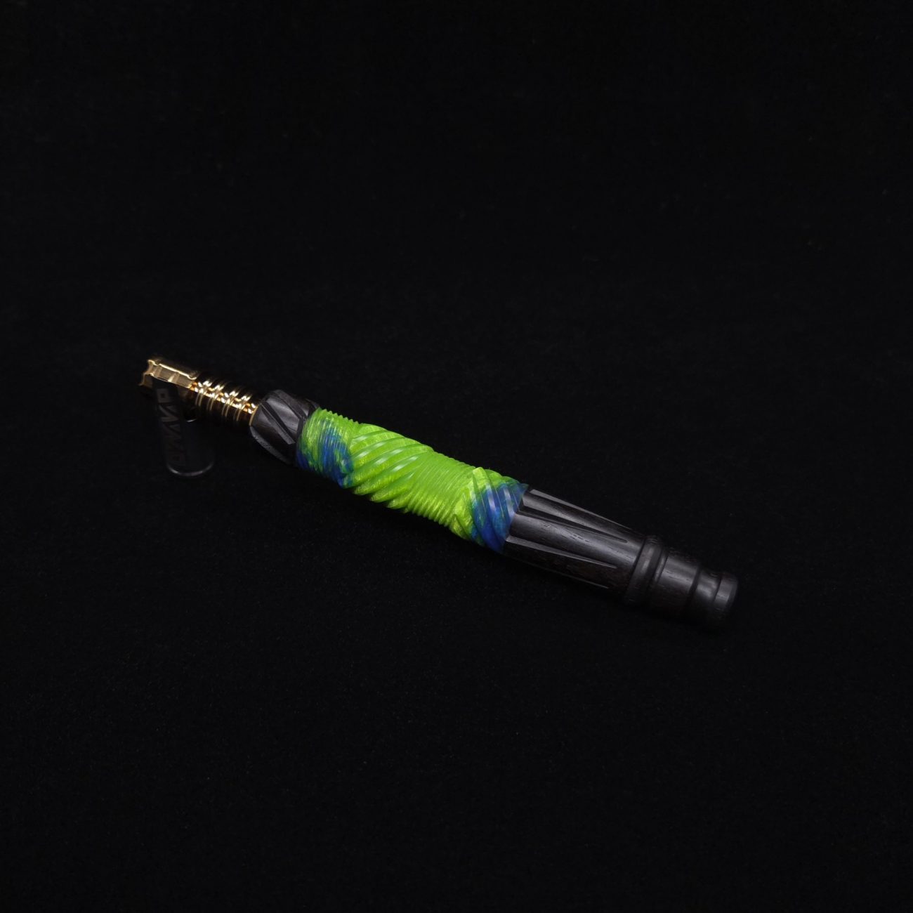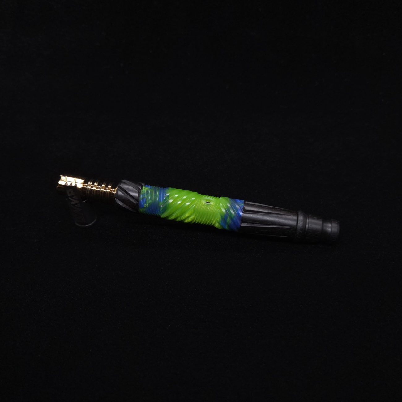 High quality pure black ebony wood hybrid XL length stem for Dynavap components. Along with (2) mouthpieces as a Halloween special…one specialty design ebony wpa m.p. that allows to adapt stem to glass devices and one green/blue luminescent m.p. that glows green in the dark. Hybrid colors are a vibrant metallic green and blue. This newest twisted stems series stem design is a personal favorite. It is another of our stem designs that has an amazing detailed complex cut that’s usually reserved for metal, but we’ve applied it to certain wood/resin stems that can hold such detailed cuts…and look great doing it. The design is essentially a set of spiraled lines that have been twisted and bent into sections that all use different angles while conforming to the desired layout where your finger rests perfectly over the centered air-port. The v-cut lines are a great tactile feature. To connect to glass device with a 14mm tapered hole, simply slide one of the included o-rings over the mouthpiece that will rest in the groove on the mouthpiece. This will produce the air-tight seal needed to pull flawless hits. All of our stems function with or without mouthpiece attached. Stem has been finished with a low gloss finish polishing and is all natural.