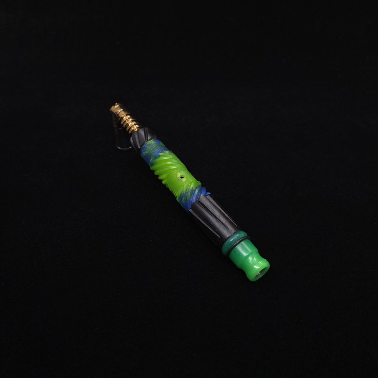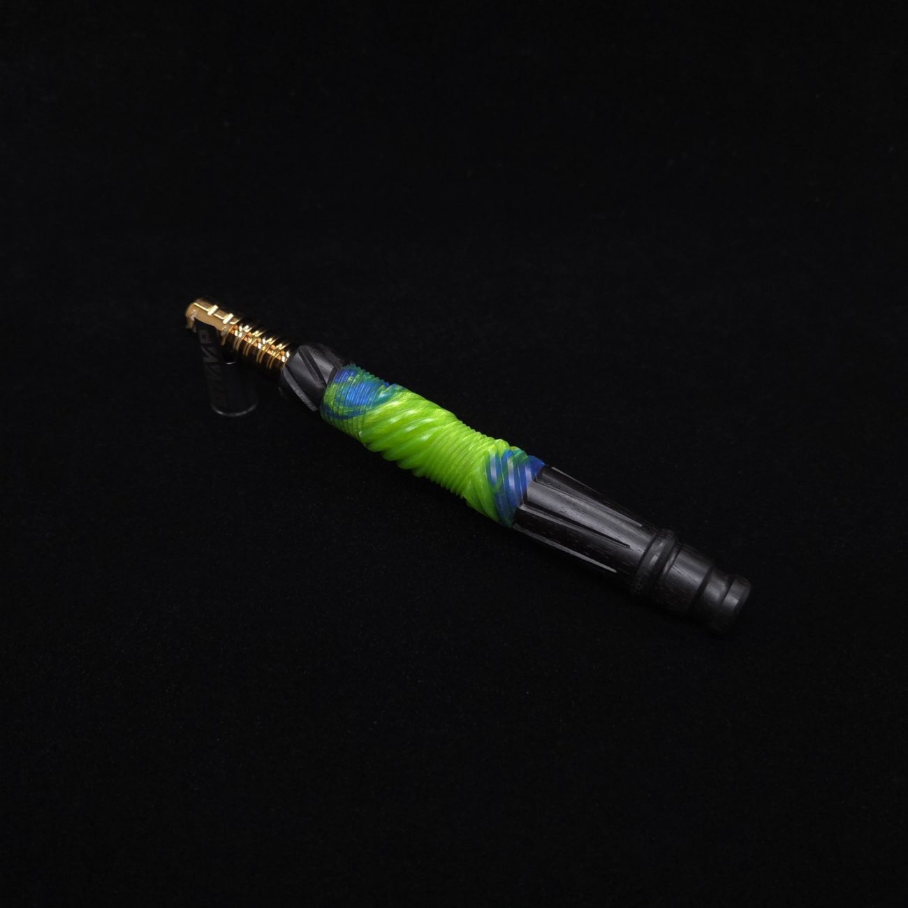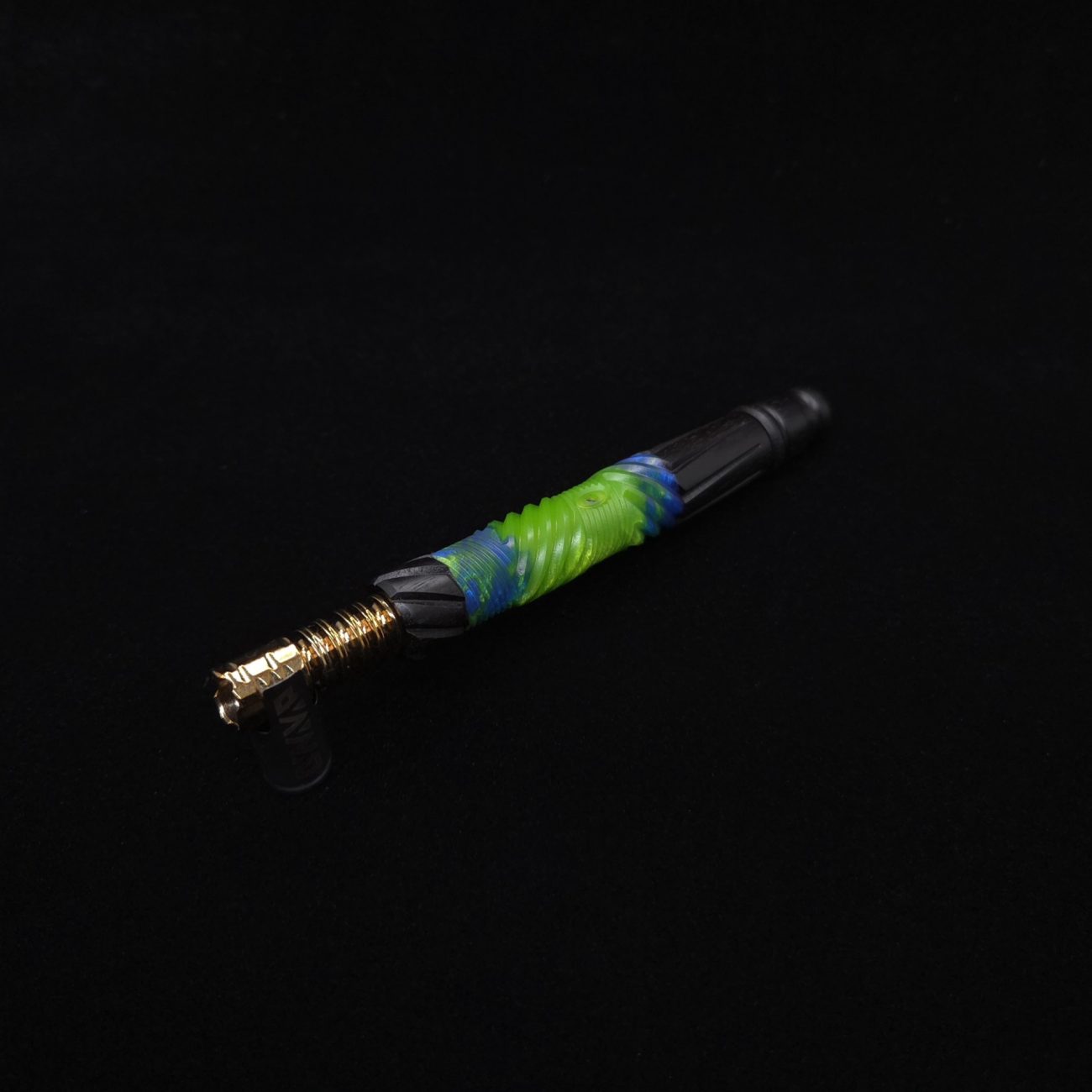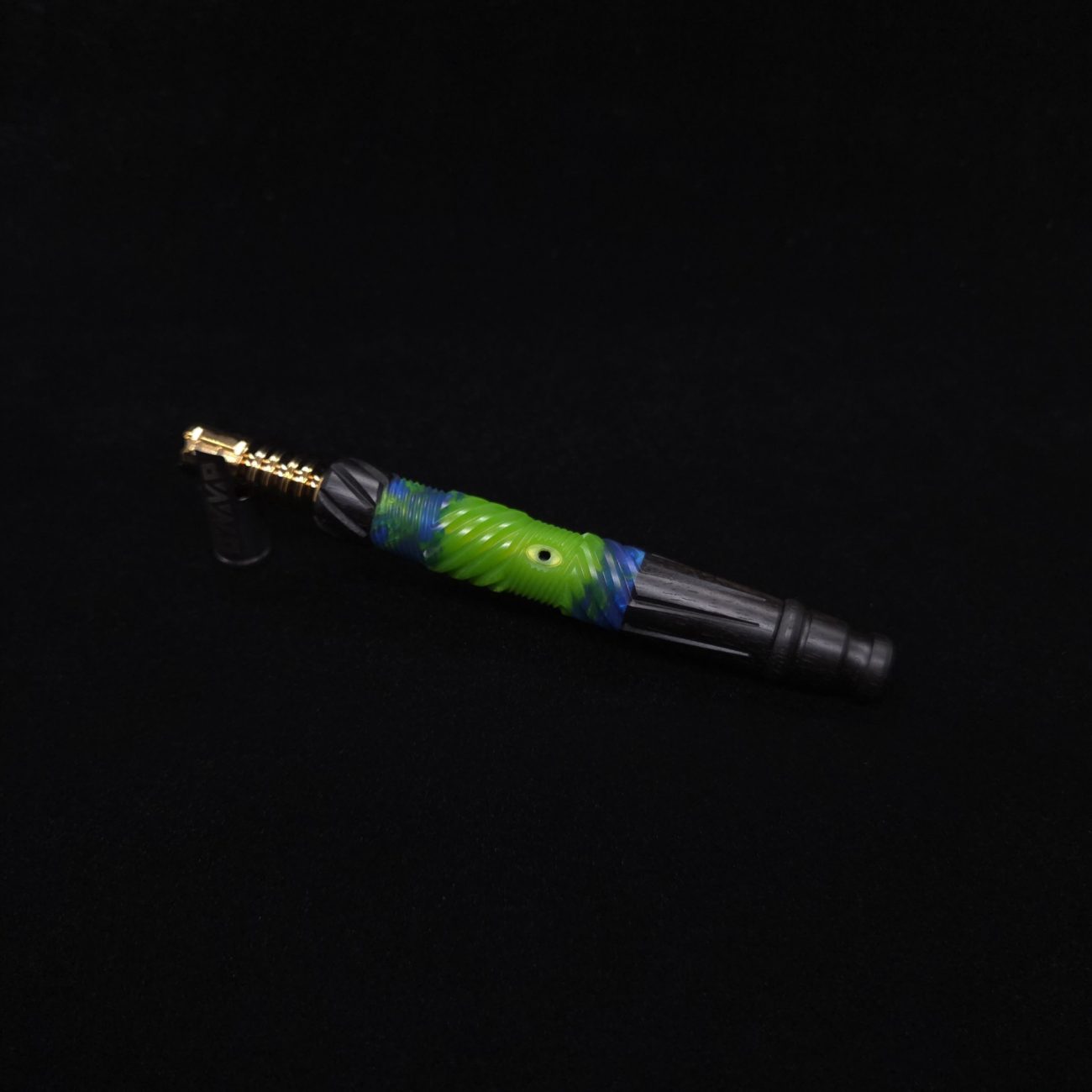 High quality pure black ebony wood hybrid XL length stem for Dynavap components. Along with (2) mouthpieces as a Halloween special…one specialty design ebony wpa m.p. that allows to adapt stem to glass devices and one green/blue luminescent m.p. that glows green in the dark. Hybrid colors are a vibrant metallic green and blue. This newest twisted stems series stem design is a personal favorite. It is another of our stem designs that has an amazing detailed complex cut that’s usually reserved for metal, but we’ve applied it to certain wood/resin stems that can hold such detailed cuts…and look great doing it. The design is essentially a set of spiraled lines that have been twisted and bent into sections that all use different angles while conforming to the desired layout where your finger rests perfectly over the centered air-port. The v-cut lines are a great tactile feature. To connect to glass device with a 14mm tapered hole, simply slide one of the included o-rings over the mouthpiece that will rest in the groove on the mouthpiece. This will produce the air-tight seal needed to pull flawless hits. All of our stems function with or without mouthpiece attached. Stem has been finished with a low gloss finish polishing and is all natural.