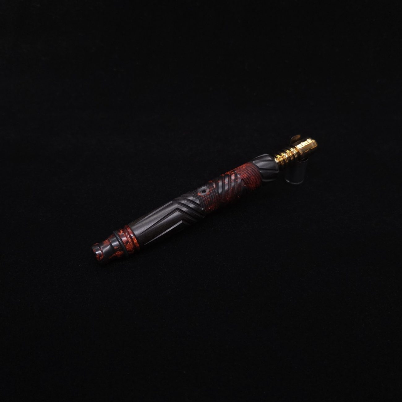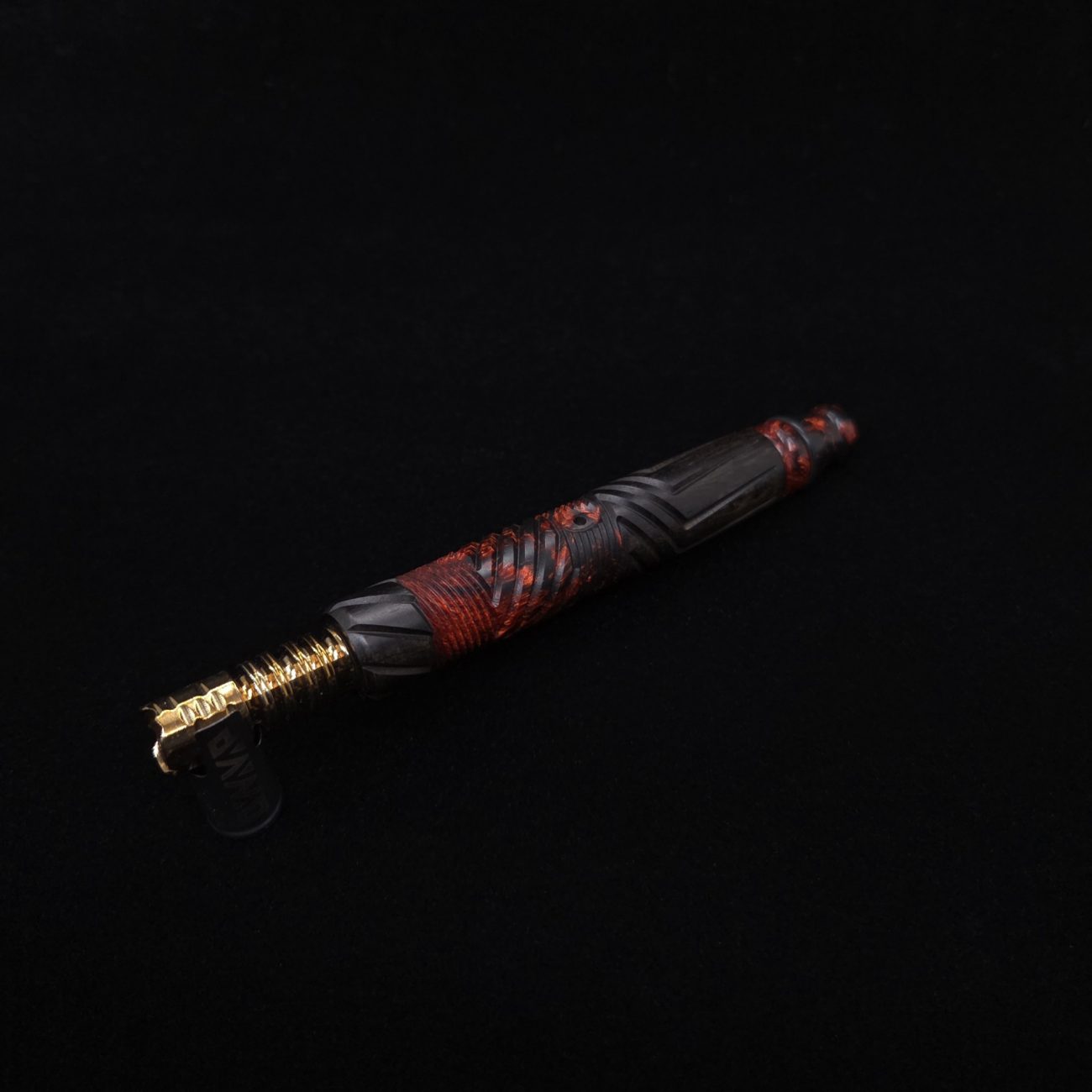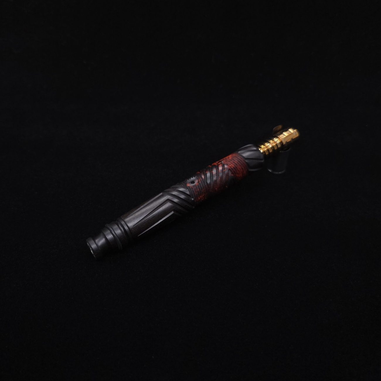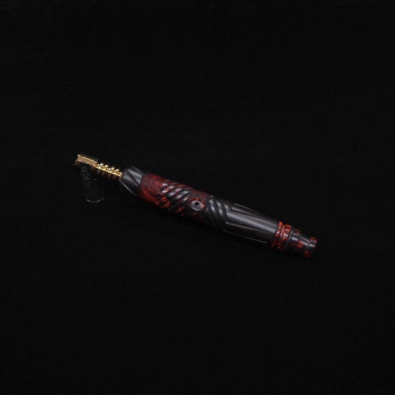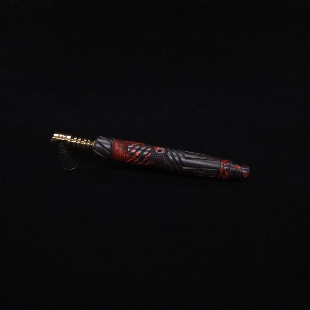 High quality pure black ebony wood hybrid XL length stem for Dynavap components. Along with (2) mouthpieces that are capable of adapting to a glass device with a 14mm tapered hole or used without o-rings for regular usage. Hybrid colors are a vibrant molten lava theme in metallic black and fire coloring. This newest twisted stems series stem design is a personal favorite. It is another of our stem designs that has an amazing detailed complex cut that’s usually reserved for metal, but we’ve applied it to certain wood/resin stems that can hold such detailed cuts…and look great doing it. The design is essentially a set of spiraled lines that have been twisted and bent into sections that all use different angles while conforming to the desired layout where your finger rests perfectly over the centered air-port. The v-cut lines are a great tactile feature. To connect to glass device with a 14mm tapered hole, simply slide one of the included o-rings over the mouthpiece that will rest in the groove on the mouthpiece. This will produce the air-tight seal needed to pull flawless hits. All of our stems function with or without mouthpiece attached. Stem has been finished with a low gloss finish polishing and is all natural.