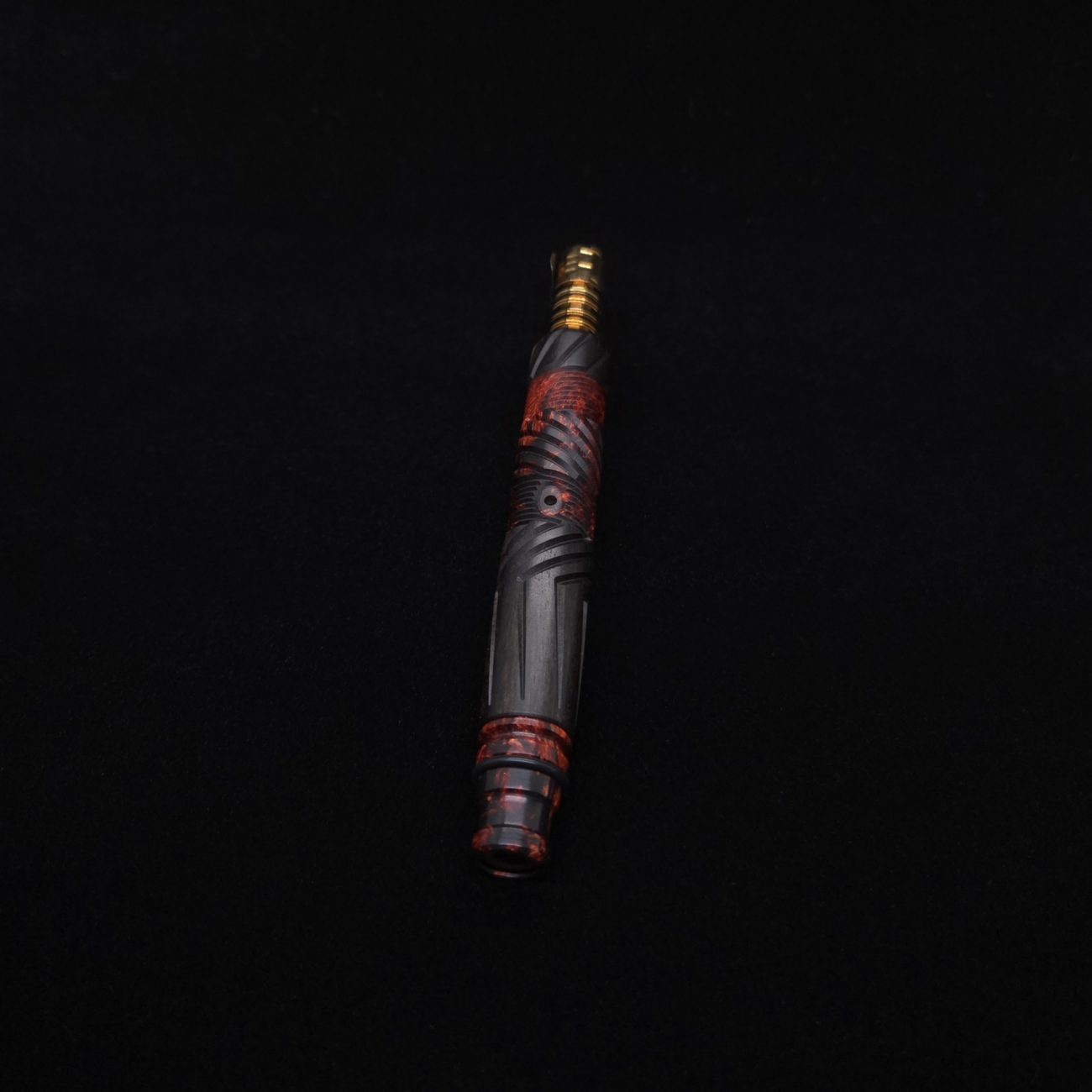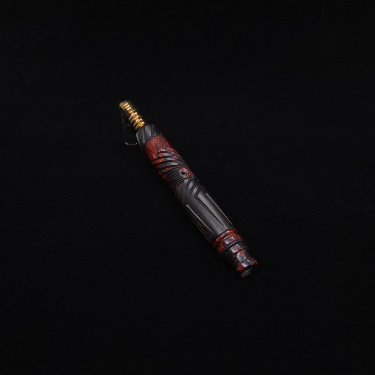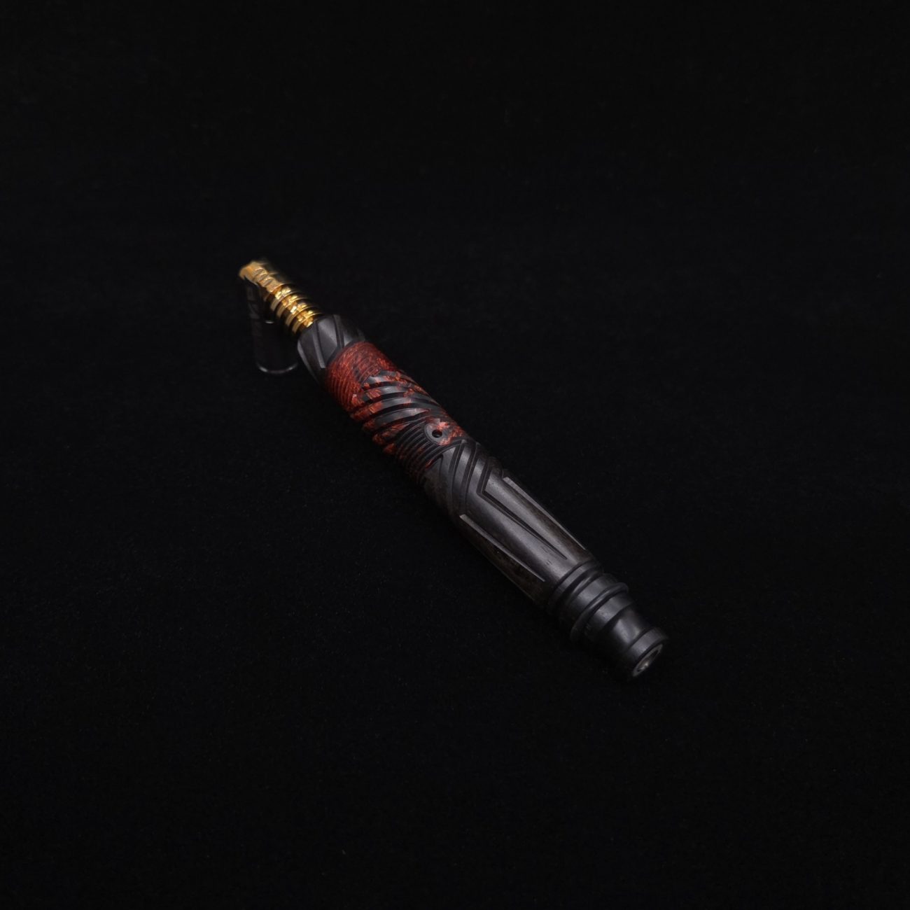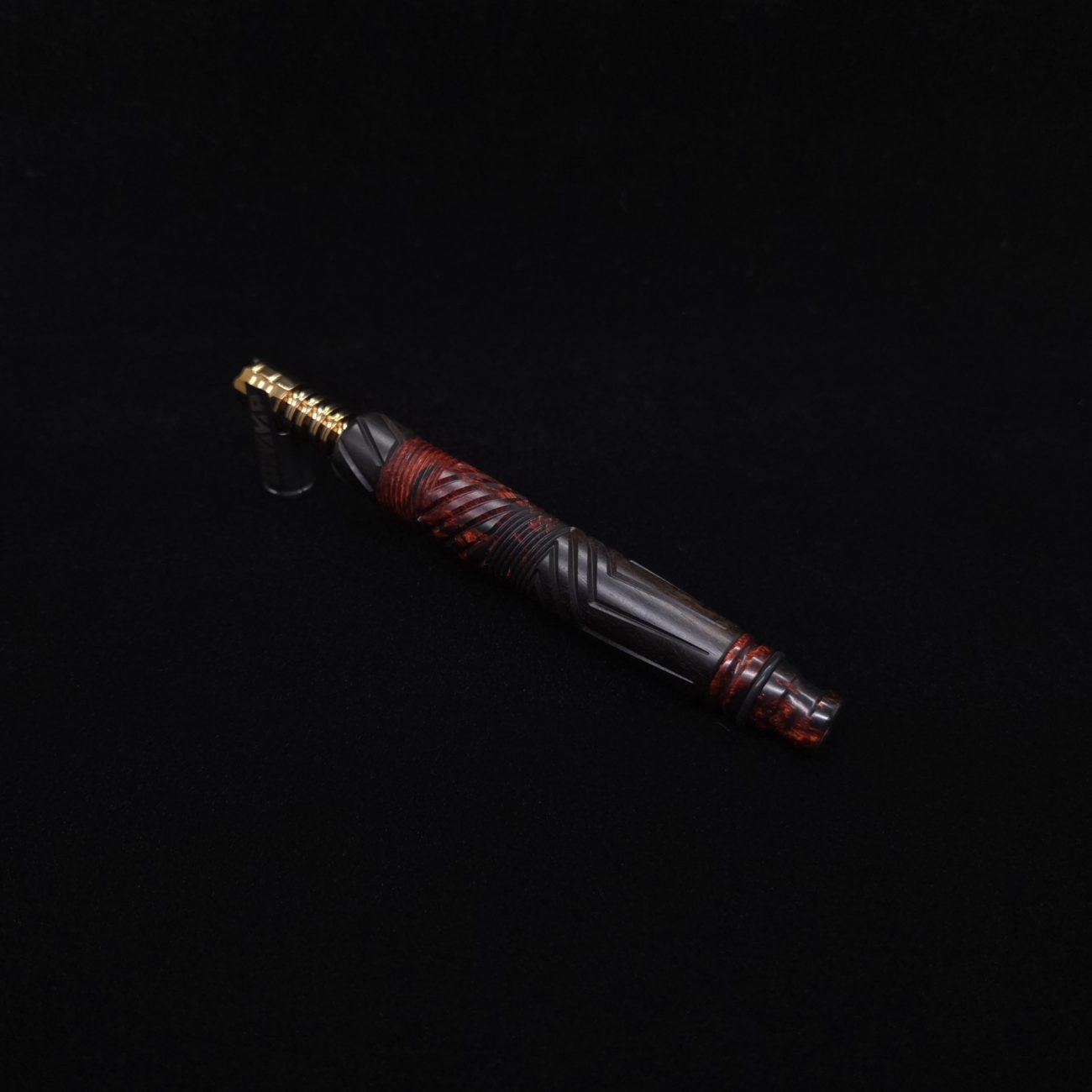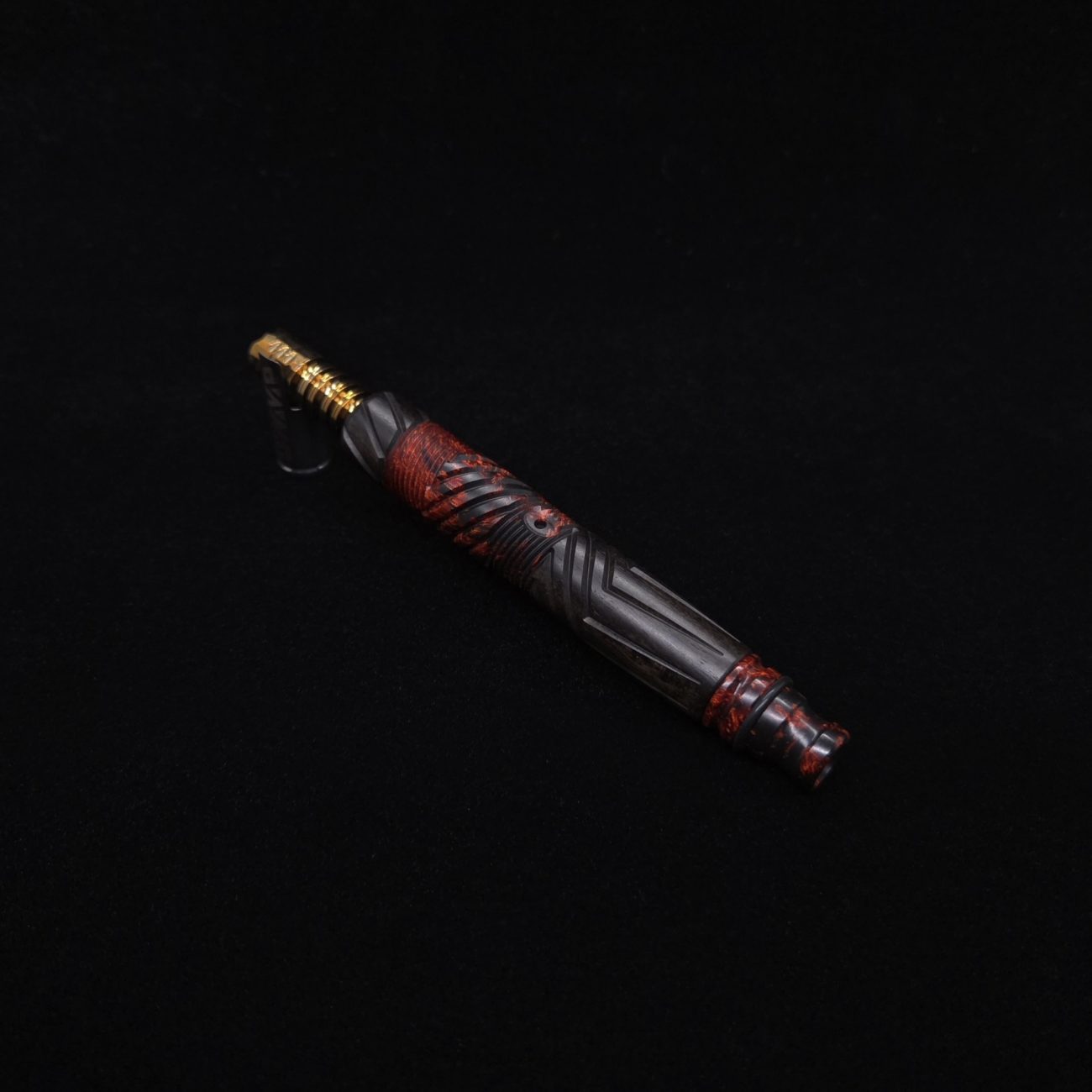 High quality pure black ebony wood hybrid XL length stem for Dynavap components. Along with (2) mouthpieces that are capable of adapting to a glass device with a 14mm tapered hole or used without o-rings for regular usage. Hybrid colors are a vibrant molten lava theme in metallic black and fire coloring. This newest twisted stems series stem design is a personal favorite. It is another of our stem designs that has an amazing detailed complex cut that’s usually reserved for metal, but we’ve applied it to certain wood/resin stems that can hold such detailed cuts…and look great doing it. The design is essentially a set of spiraled lines that have been twisted and bent into sections that all use different angles while conforming to the desired layout where your finger rests perfectly over the centered air-port. The v-cut lines are a great tactile feature. To connect to glass device with a 14mm tapered hole, simply slide one of the included o-rings over the mouthpiece that will rest in the groove on the mouthpiece. This will produce the air-tight seal needed to pull flawless hits. All of our stems function with or without mouthpiece attached. Stem has been finished with a low gloss finish polishing and is all natural.