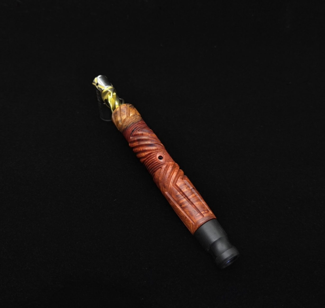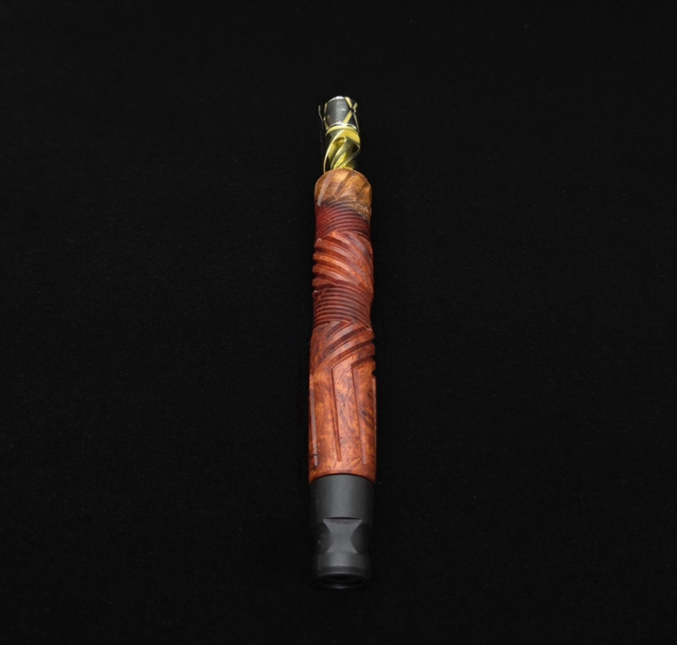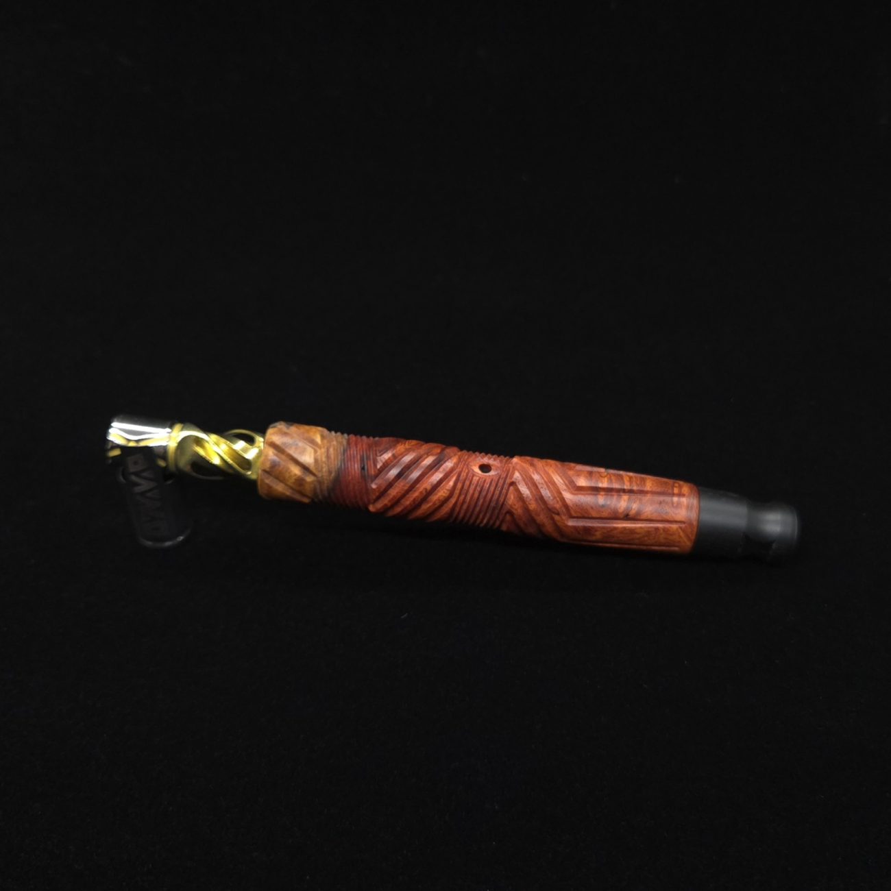 High quality amboyna burl wood XL length stem for Dynavap components. Along with a matched ebony dual sided design mouthpiece. This newest twisted stems series stem design is a personal favorite. It is another of our stem designs that has an amazing detailed complex cut that’s usually reserved for metal, but we’ve applied it to certain wood/resin stems that can hold such detailed cuts…and look great doing it. The design is essentially a set of spiraled lines that have been twisted and bent into sections that all use different angles while conforming to the desired layout where your finger rests perfectly over the centered air-port. The v-cut lines are a great tactile feature. The mouthpiece is a dual sided m.p. that has two flat sides and two rounded concave sides. All of our stems function with or without mouthpiece attached. Stem has been finished with a satin finish polishing and is all natural.