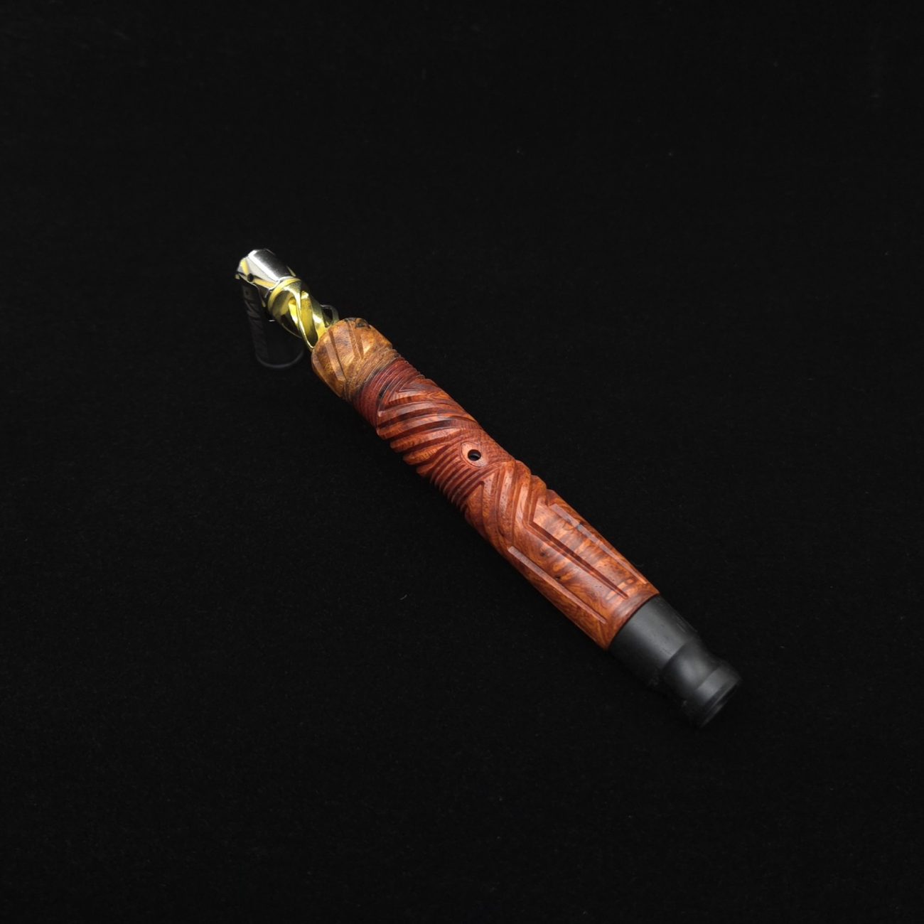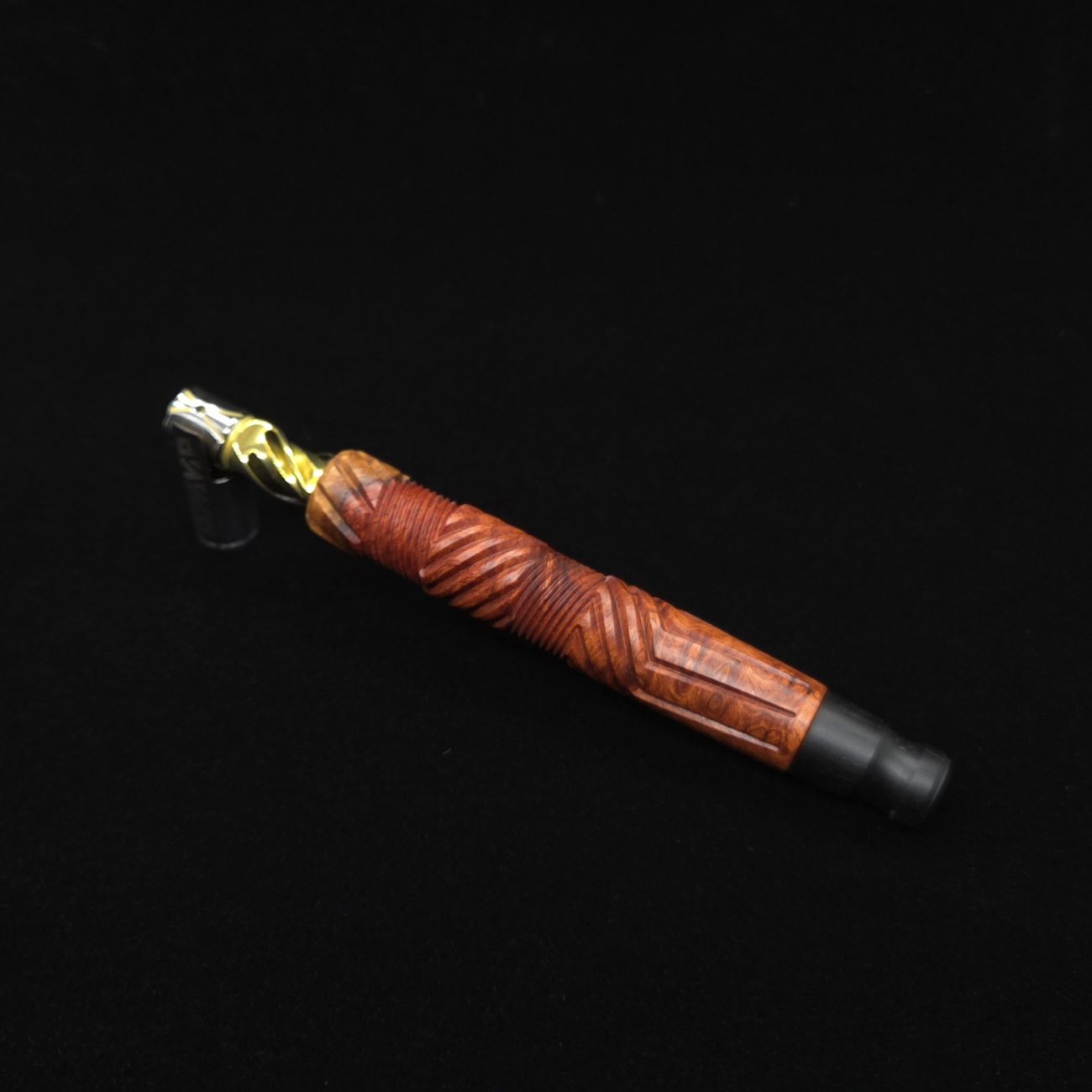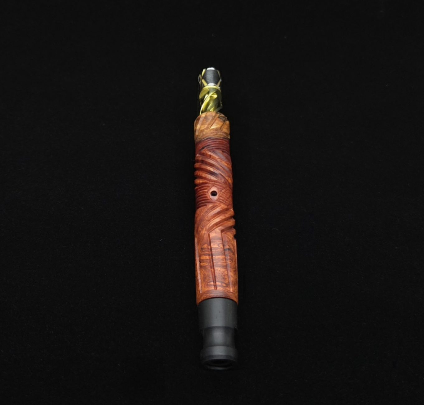 High quality amboyna burl wood XL length stem for Dynavap components. Along with a matched ebony dual sided design mouthpiece. This newest twisted stems series stem design is a personal favorite. It is another of our stem designs that has an amazing detailed complex cut that’s usually reserved for metal, but we’ve applied it to certain wood/resin stems that can hold such detailed cuts…and look great doing it. The design is essentially a set of spiraled lines that have been twisted and bent into sections that all use different angles while conforming to the desired layout where your finger rests perfectly over the centered air-port. The v-cut lines are a great tactile feature. The mouthpiece is a dual sided m.p. that has two flat sides and two rounded concave sides. All of our stems function with or without mouthpiece attached. Stem has been finished with a satin finish polishing and is all natural.