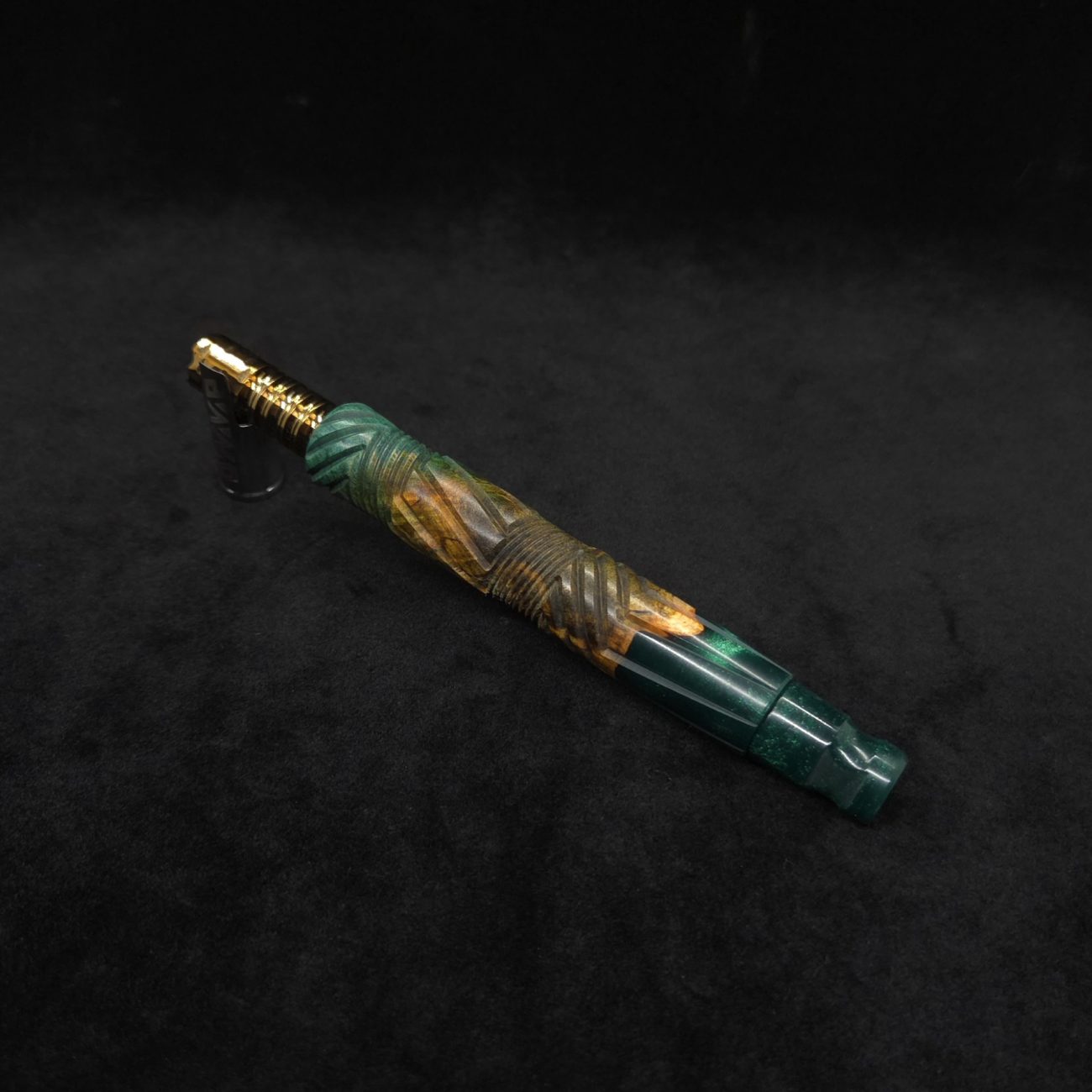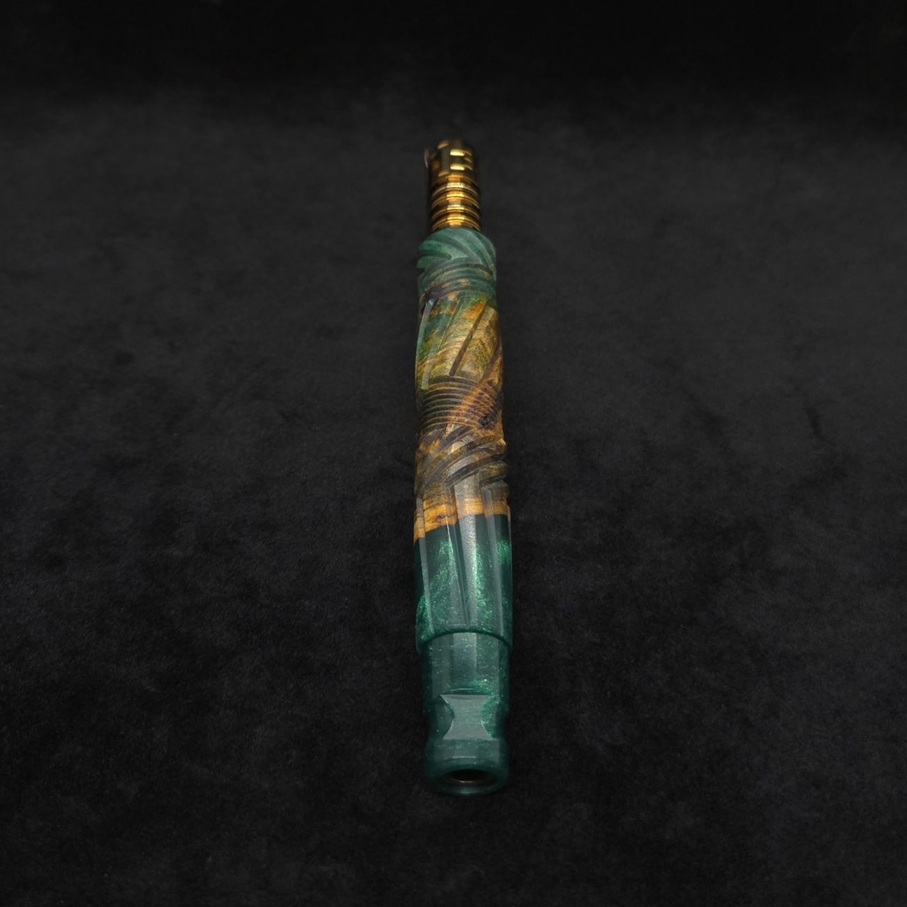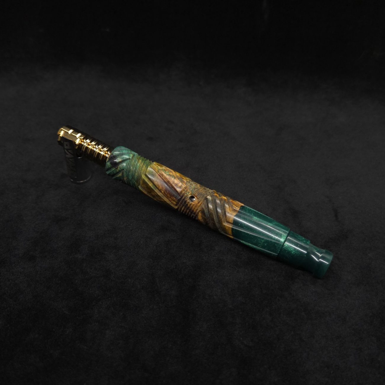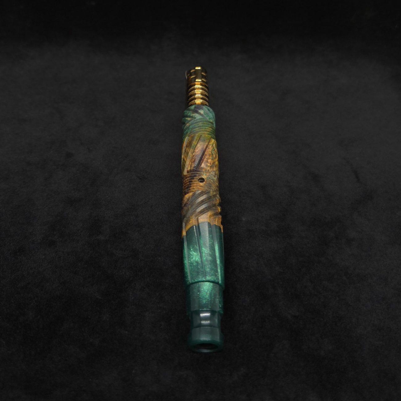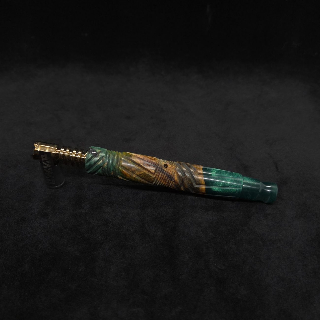 High quality buckeye burl wood hybrid XL length stem for Dynavap components. Along with a book-matched dual sided design mouthpiece. Burl colors are teal, orange and gold/green with hybrid color in metallic emerald green. This newest twisted stems series stem design is a personal favorite. It is another of our stem designs that has an amazing detailed complex cut that’s usually reserved for metal, but we’ve applied it to certain wood/resin stems that can hold such detailed cuts…and look great doing it. The design is essentially a set of spiraled lines that have been twisted and bent into sections that all use different angles while conforming to the desired layout where your finger rests perfectly over the centered air-port. The v-cut lines are a great tactile feature. The mouthpiece is a dual sided m.p. that has two flat sides and two rounded concave sides. All of our stems function with or without mouthpiece attached. Stem has been finished with a satin finish polishing and is all natural.