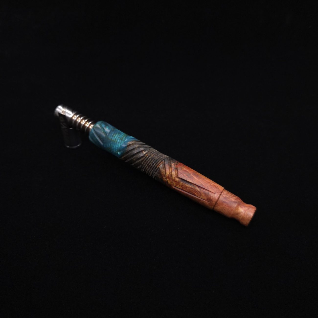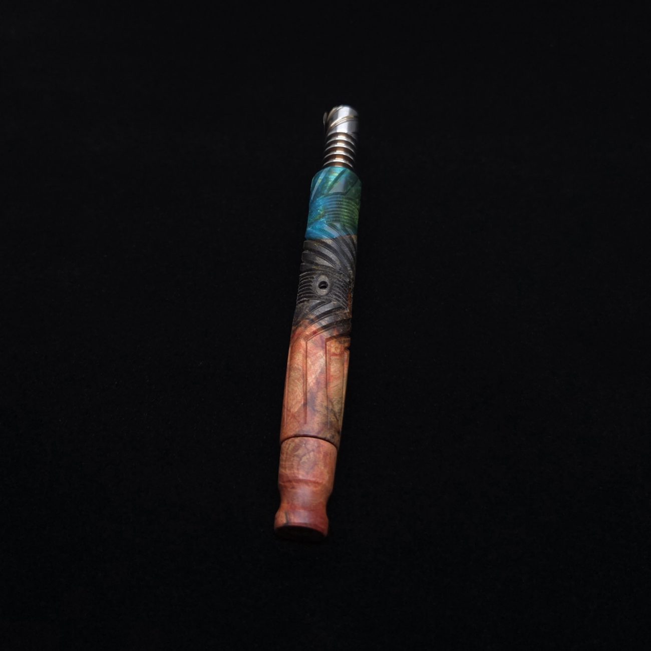 High quality buckeye burl wood hybrid XL length stem for Dynavap components. Along with a book-matched mouthpiece. Burl colors are fire orange-red and naturally occurring black areas with hybrid colors in metallic mint blue and olive green. This newest twisted stems series stem design is a personal favorite. It is another of our stem designs that has an amazing detailed complex cut that’s usually reserved for metal, but we’ve applied it to certain wood/resin stems that can hold such detailed cuts…and look great doing it. The design is essentially a set of spiraled lines that have been twisted and bent into sections that all use different angles while conforming to the desired layout where your finger rests perfectly over the centered air-port. The v-cut lines are a great tactile feature. The mouthpiece is a dual sided m.p. that has two flat sides and two rounded concave sides. All of our stems function with or without mouthpiece attached. Stem has been finished with a satin finish polishing and is all natural.