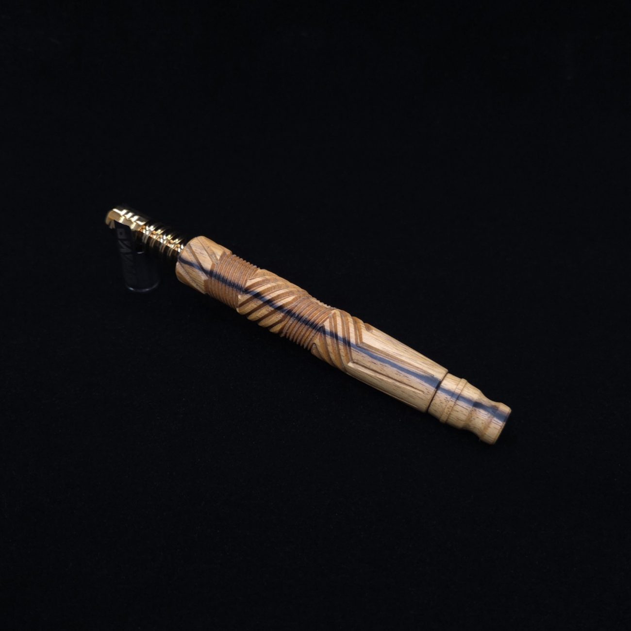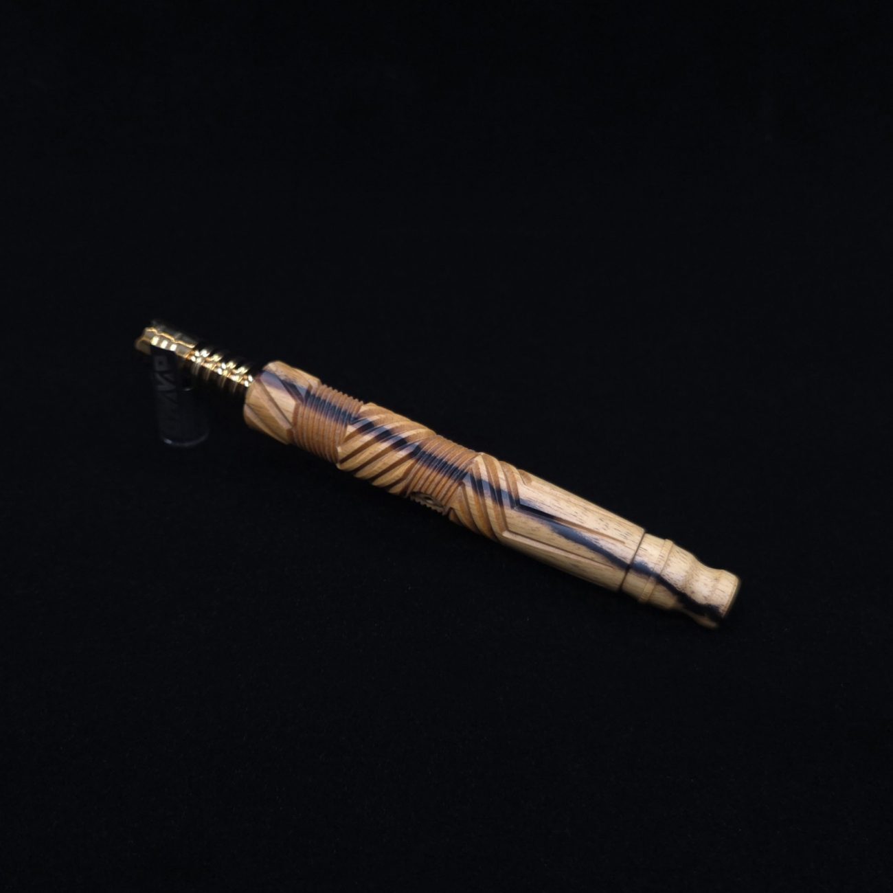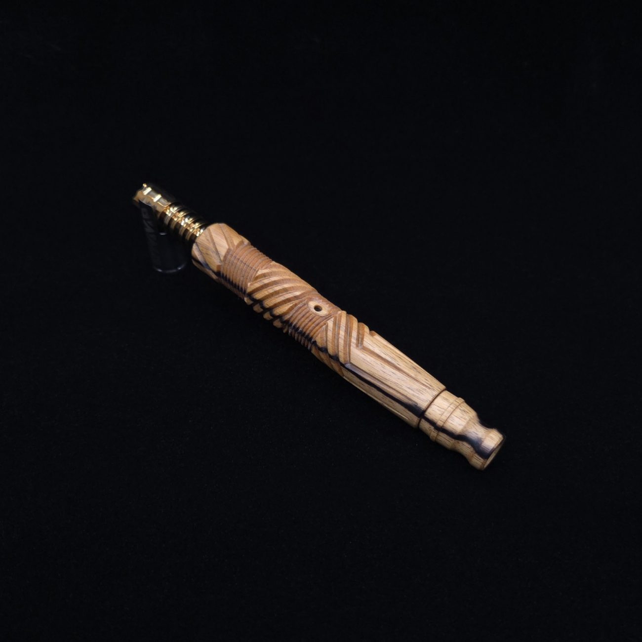 High quality pale moon (black and white) wood XL length stem for Dynavap components. Along with a book-matched barrel design mouthpiece. This newest twisted stems series stem design is a personal favorite. It is another of our stem designs that has an amazing detailed complex cut that’s usually reserved for metal, but we’ve applied it to certain wood/resin stems that can hold such detailed cuts…and look great doing it. The design is essentially a set of spiraled lines that have been twisted and bent into sections that all use different angles while conforming to the desired layout where your finger rests perfectly over the centered air-port. The v-cut lines are a great tactile feature. The mouthpiece is a dual sided m.p. that has two flat sides and two rounded concave sides. All of our stems function with or without mouthpiece attached. Stem has been finished with a satin finish polishing and is all natural.