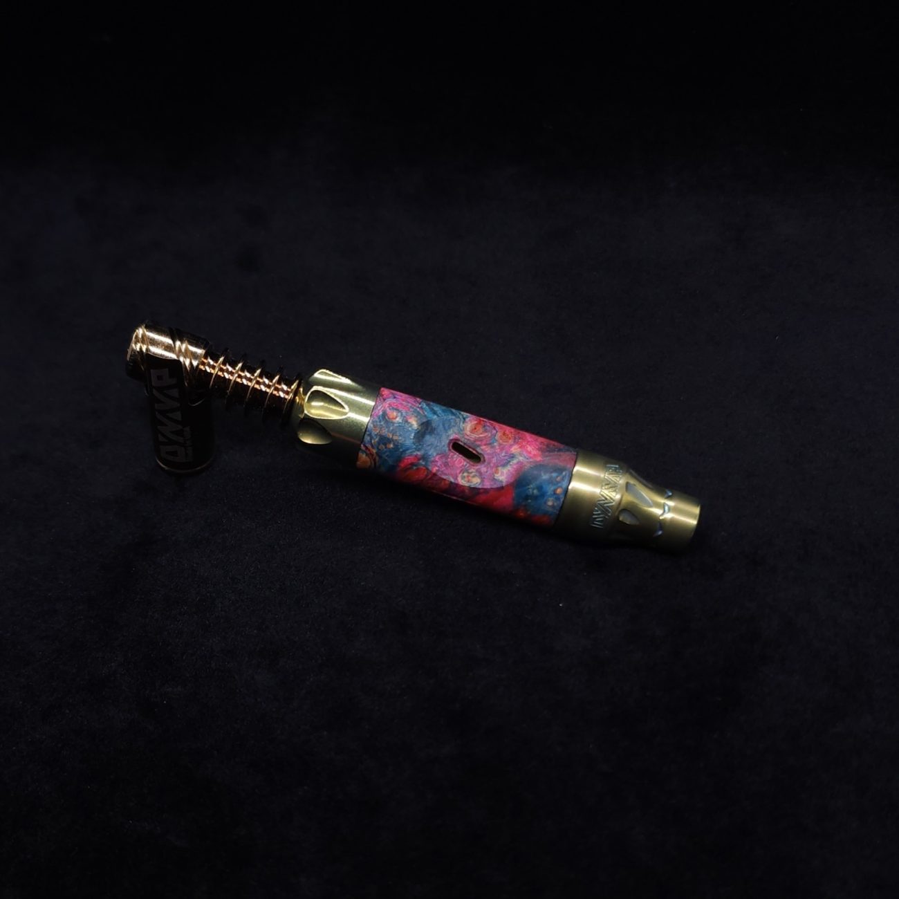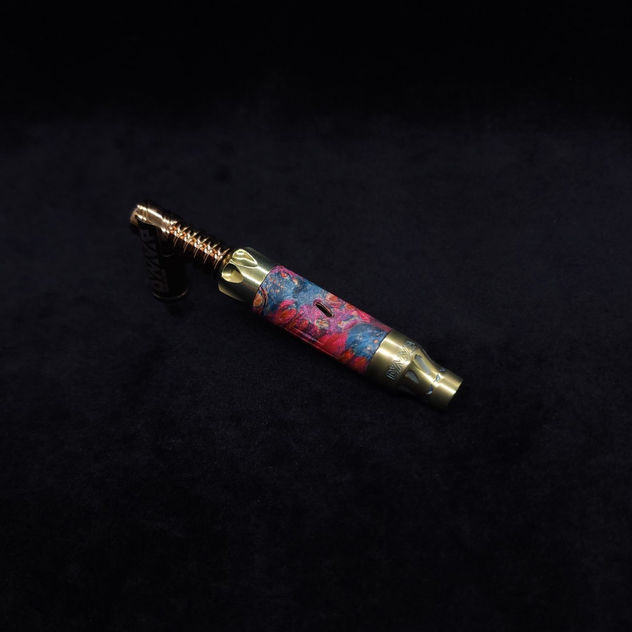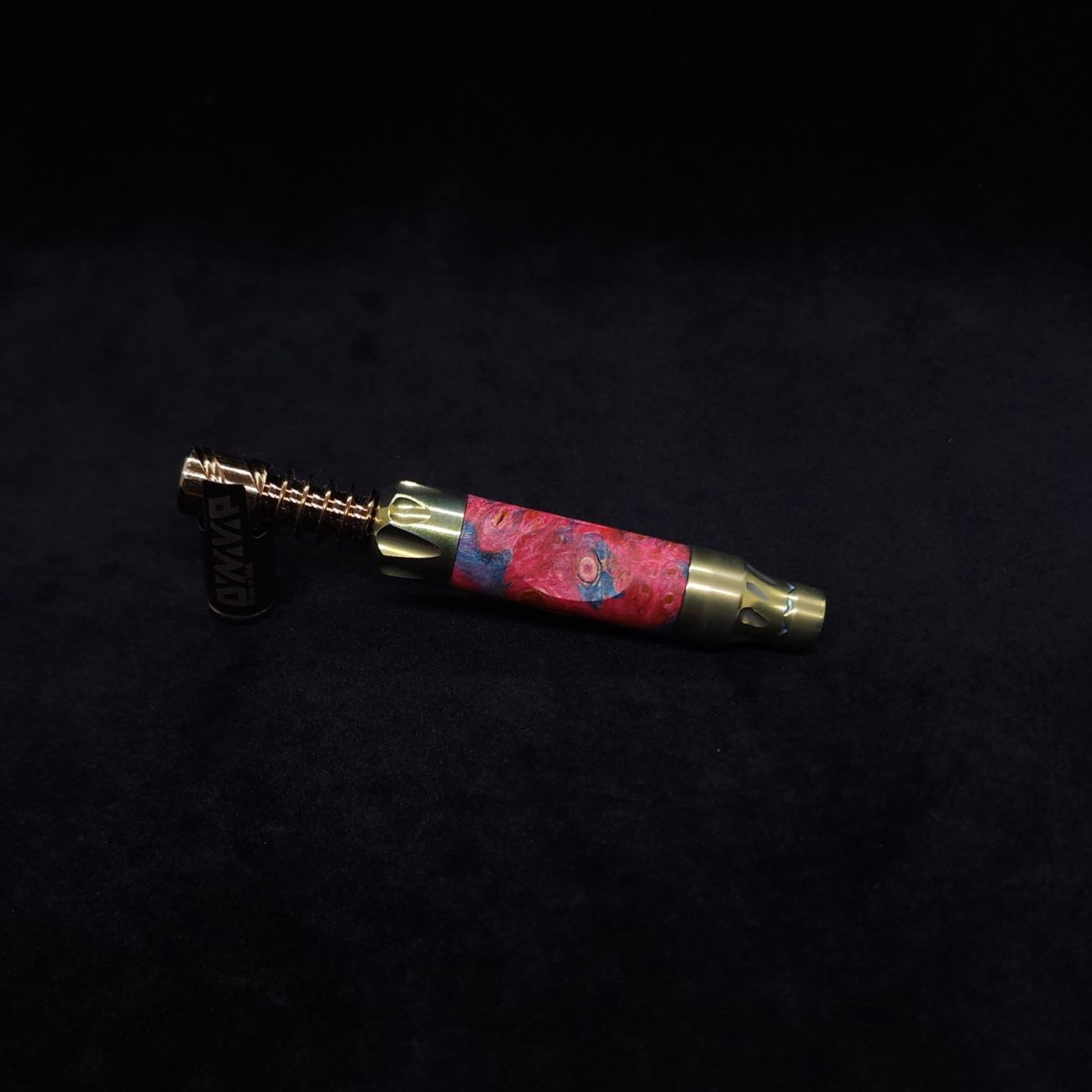 This sleeve is made from a quality piece of highly figured elm burl with vibrant pink and blue coloring. It has the standard vong slant style air-port with our added v-cut lines on the sides. This device and sleeve setup is perfect for those who love air-ports and those who don’t, as you can simply twist the mouthpiece end to have the port hole active or inactive with just a quarter turn.