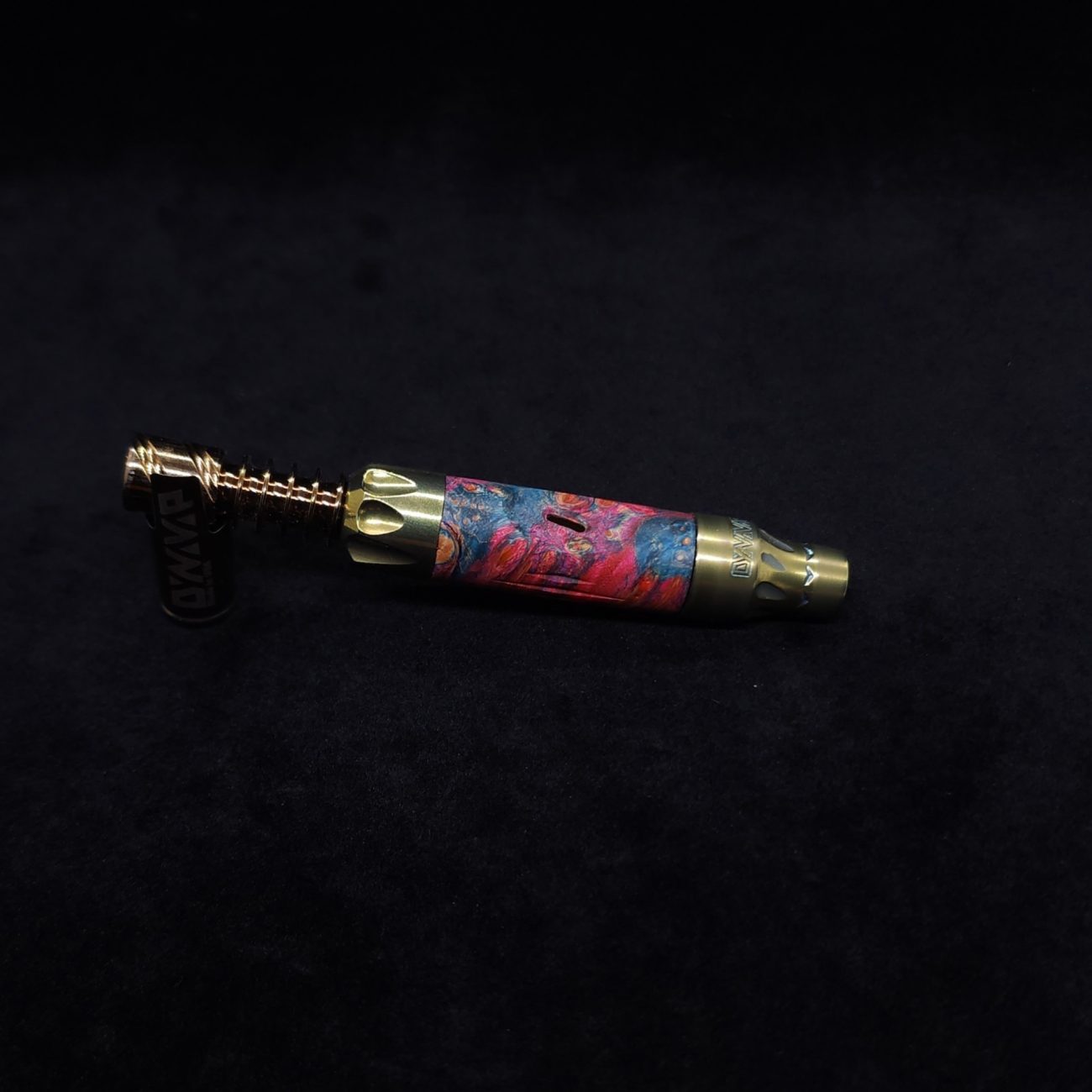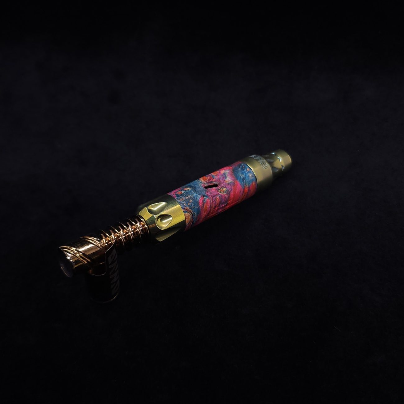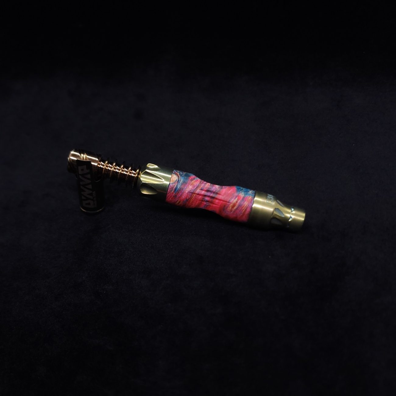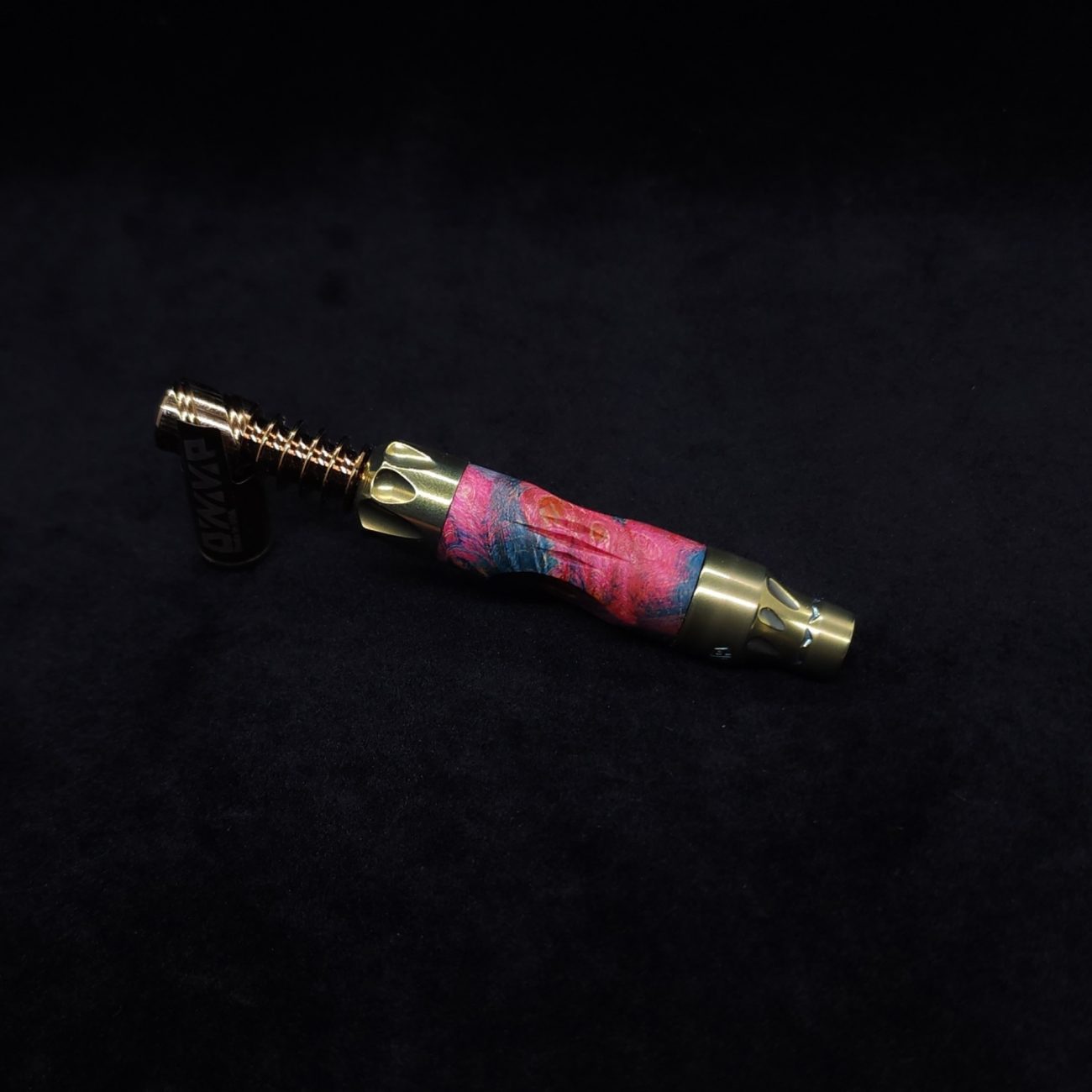 This sleeve is made from a quality piece of highly figured elm burl with vibrant pink and blue coloring. It has the standard vong slant style air-port with our added v-cut lines on the sides. This device and sleeve setup is perfect for those who love air-ports and those who don’t, as you can simply twist the mouthpiece end to have the port hole active or inactive with just a quarter turn.